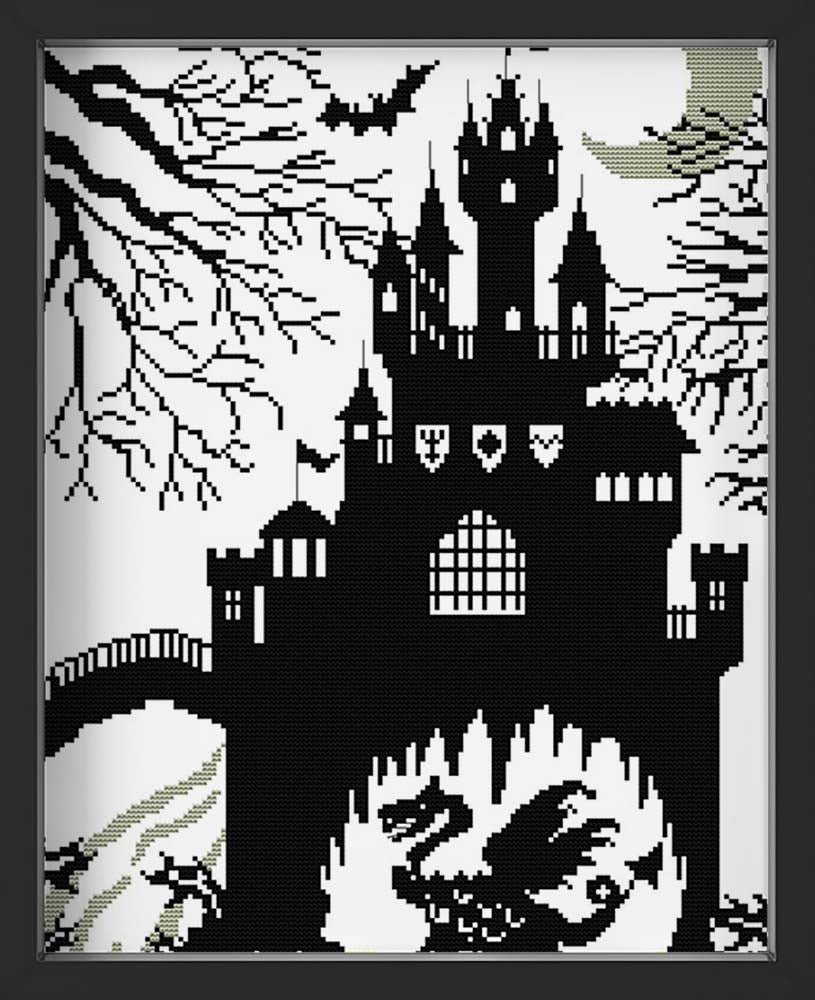 Kreuzstich - Schloss mit Drachen schwarz weiß | 30x40 cm