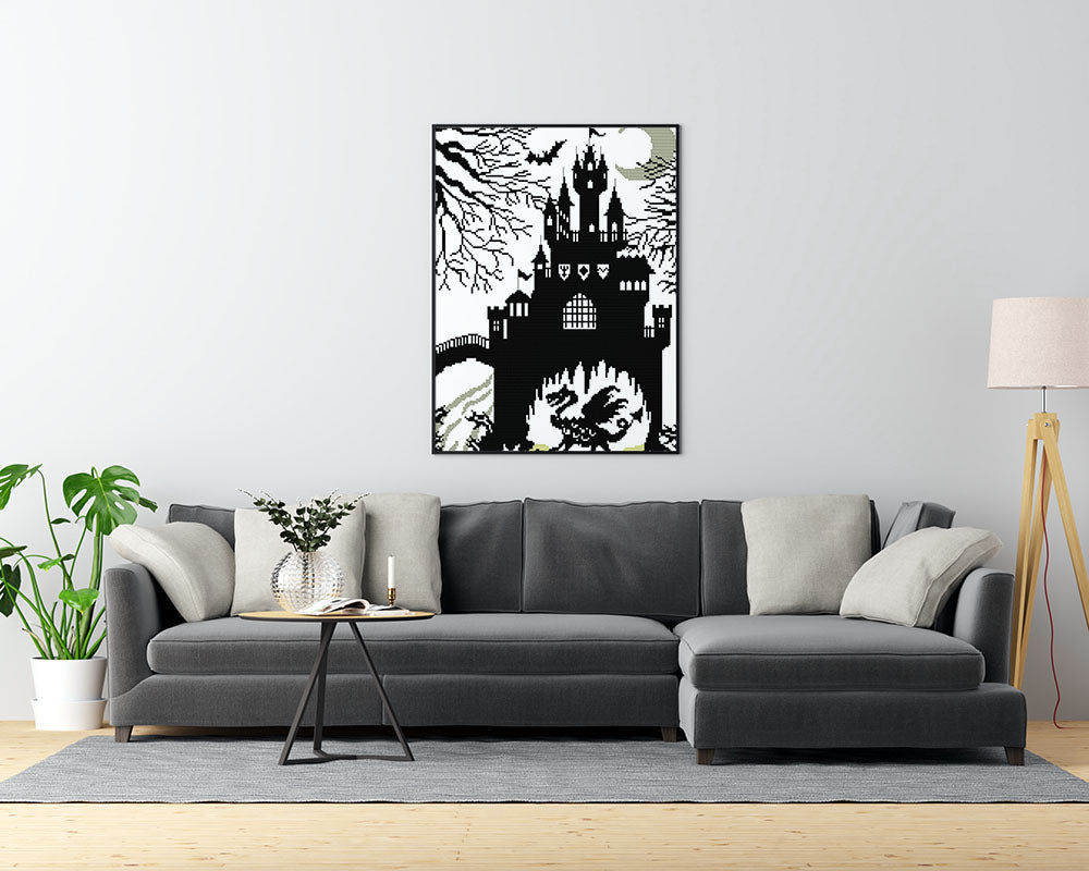 Kreuzstich - Schloss mit Drachen schwarz weiß | 30x40 cm - Diy - Fadenkunst