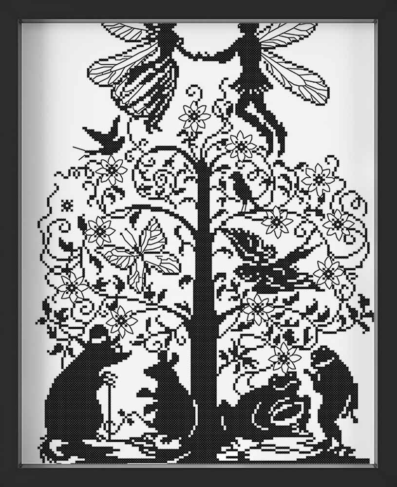 Kreuzstich - Tiere und Elfen schwarz weiß | 30x40 cm - Diy - Fadenkunst