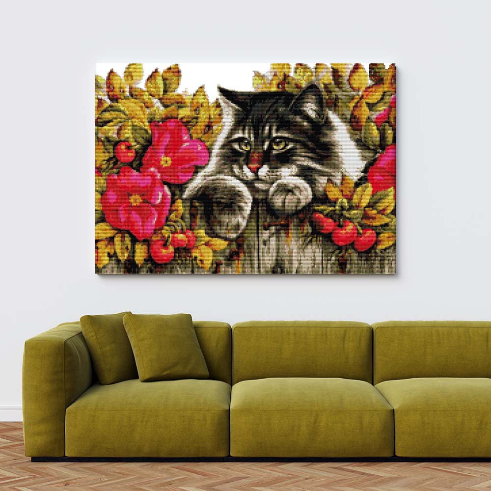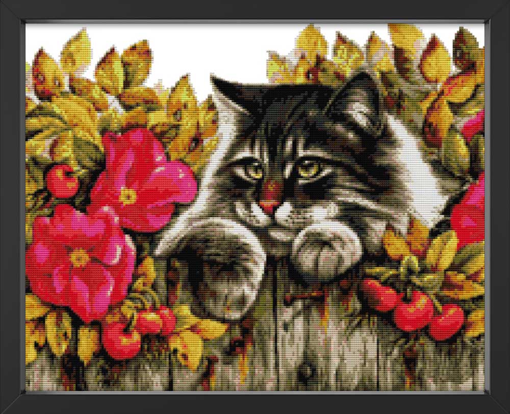 Kreuzstich - Katze lauert am Zaun | 50x40 cm - Diy - Fadenkunst