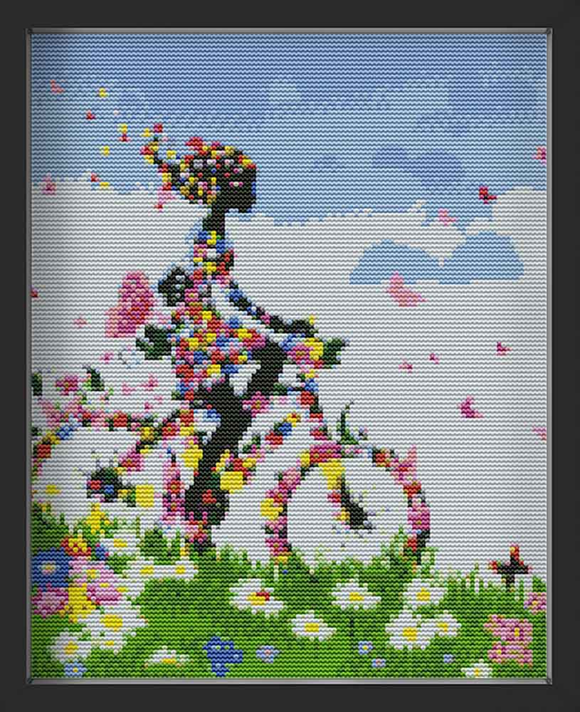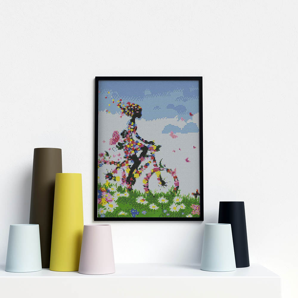 Kreuzstich -  Blumenkind mit Fahrrad | 35x35 cm - Diy - Fadenkunst