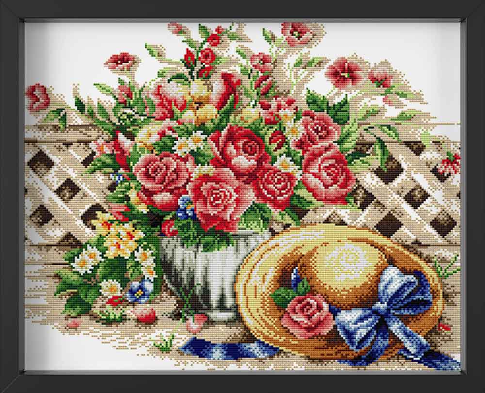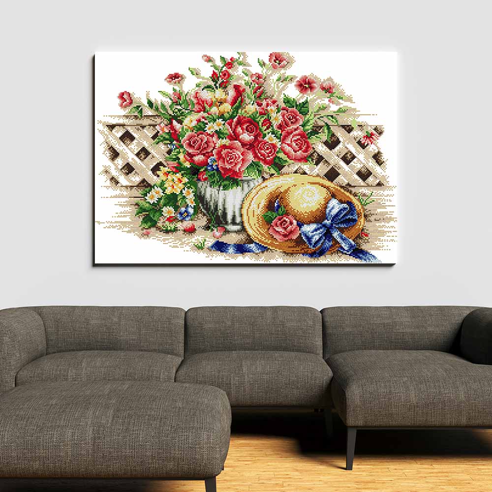 Kreuzstich - Blumenvase mit Sommerhut | 50x40 cm - Diy - Fadenkunst