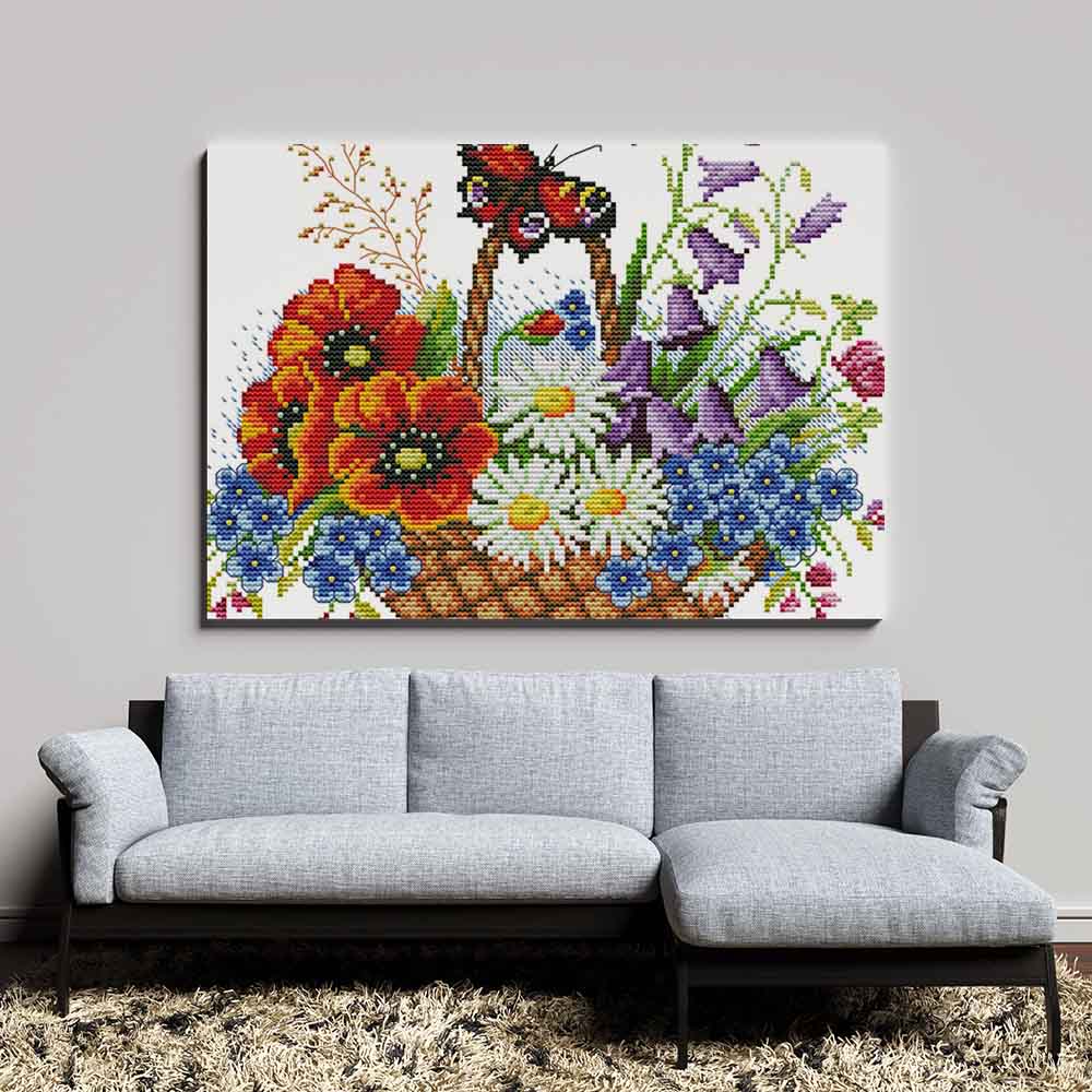 Kreuzstich - Bumenkorb mit Schmetterling | 30x30 cm - Diy - Fadenkunst