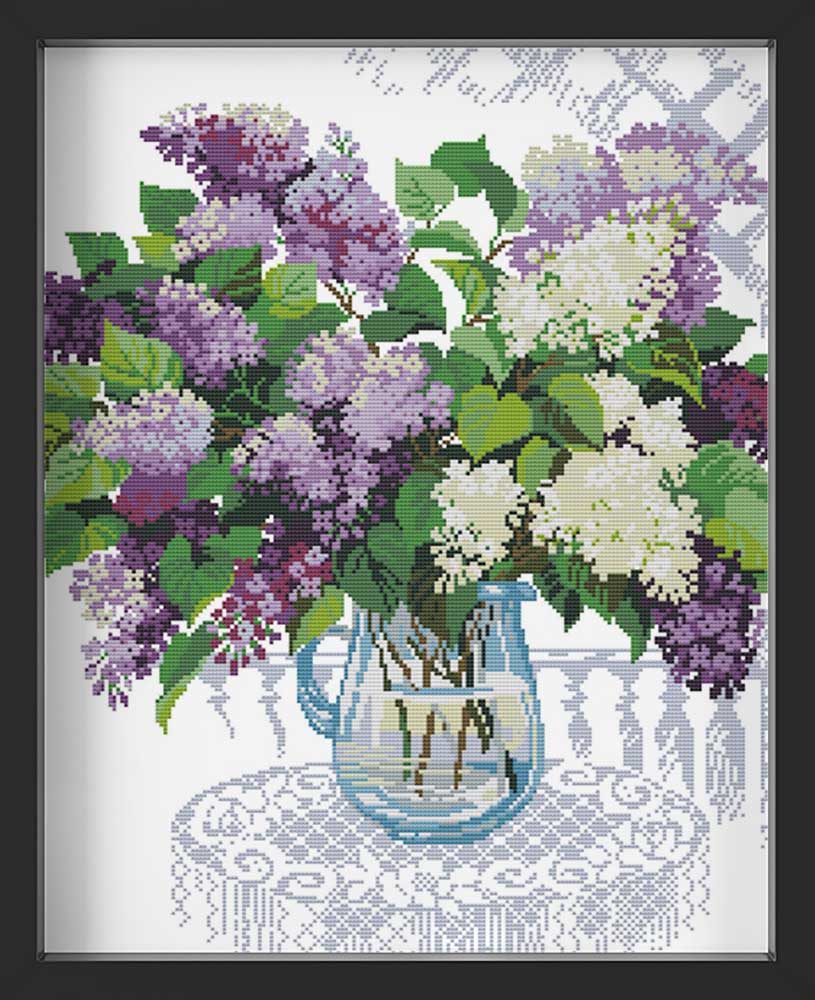 Kreuzstich - Fliederstrauß auf Tisch | 40x50 cm - Diy - Fadenkunst