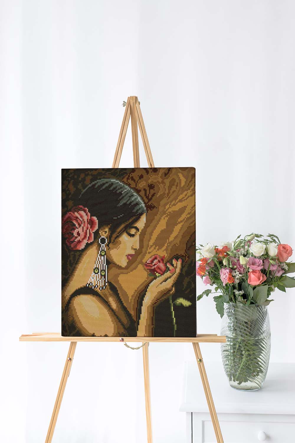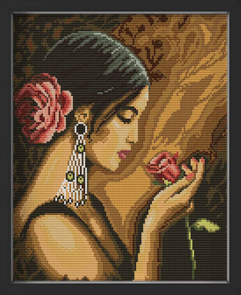 Kreuzstich - Frau mit Rose | 35x35 cm - Diy - Fadenkunst