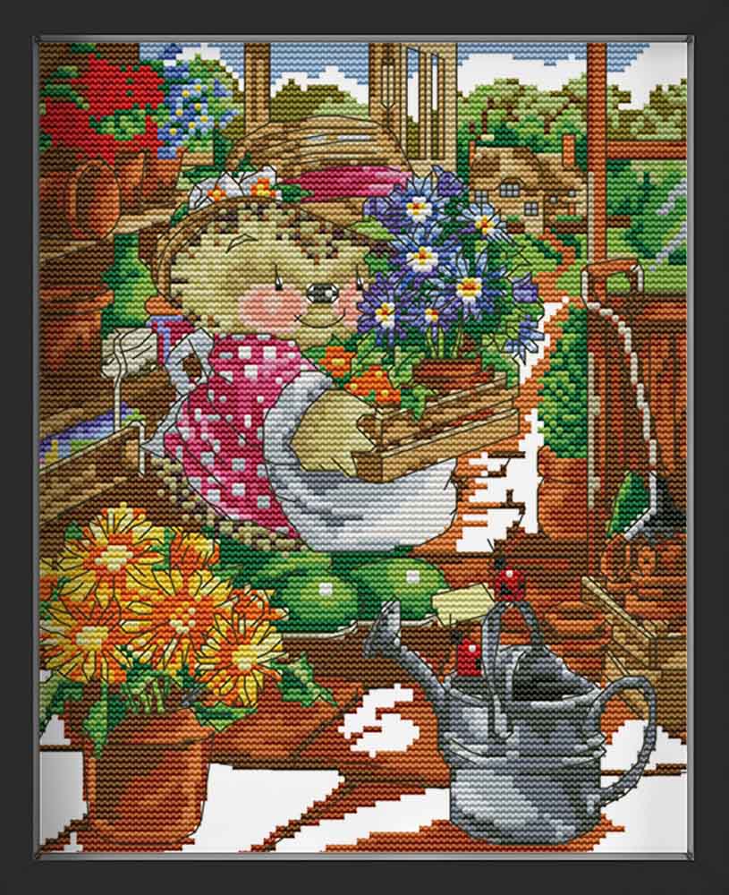 Kreuzstich - Igel am gärtnern mit Blumen | 20x30 cm