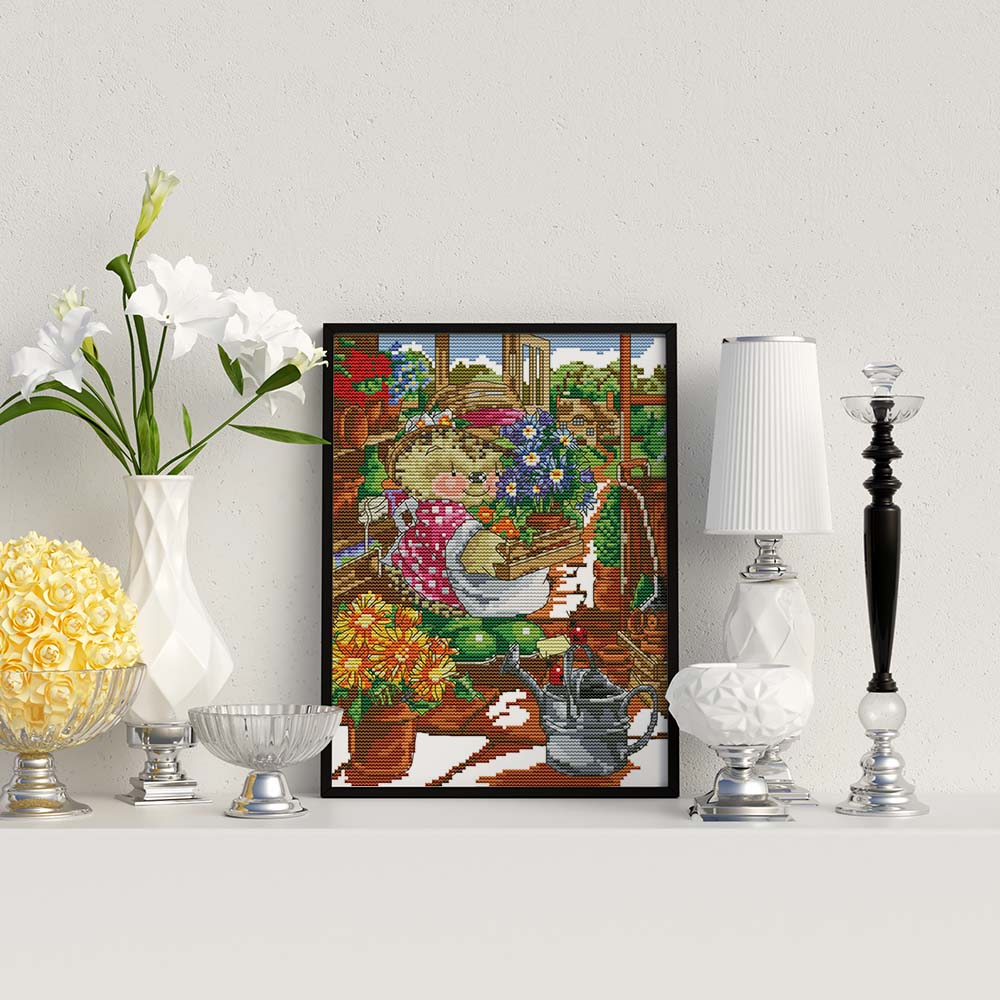 Kreuzstich - Igel am gärtnern mit Blumen | 20x30 cm - Diy - Fadenkunst