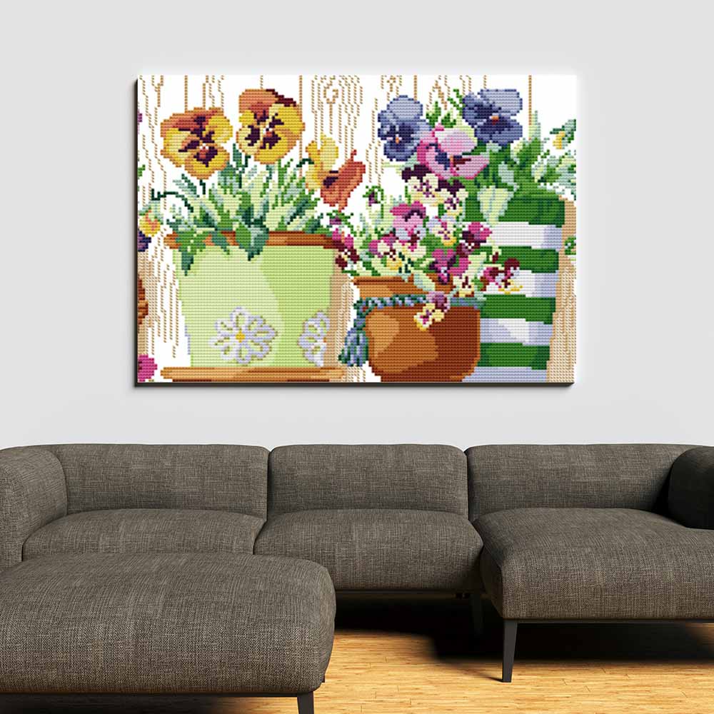 Kreuzstich - Stiefmütterchen im Topf | 50x30 cm - Diy - Fadenkunst