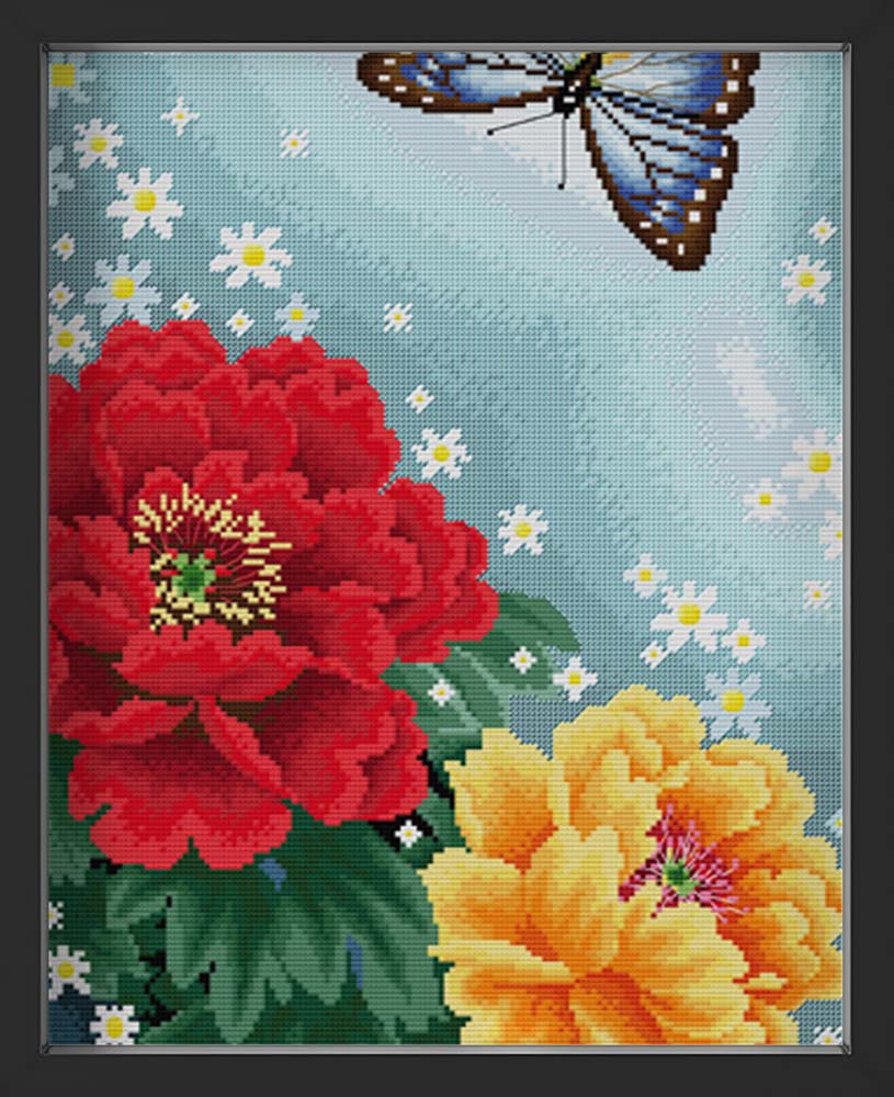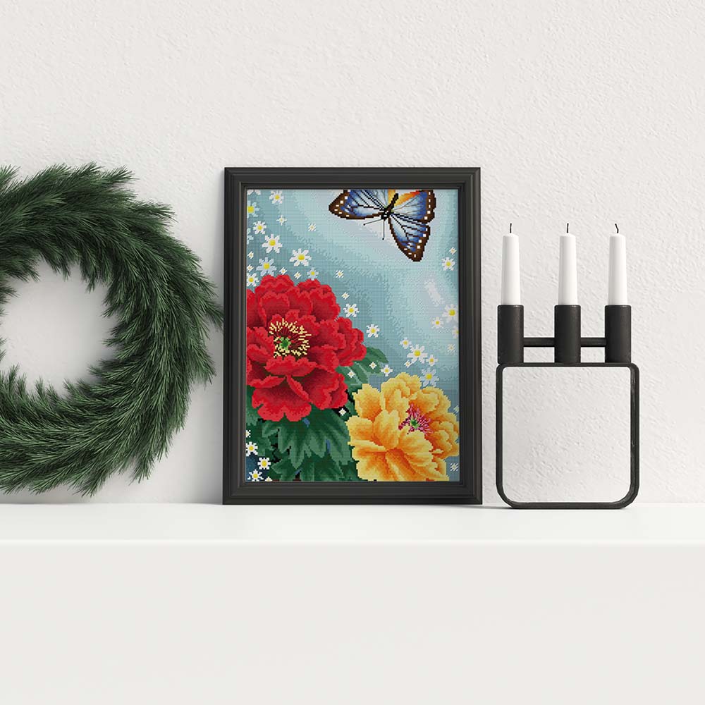 Kreuzstich - zwei große Blumen mit Schmetterling | 30x60 cm - Diy - Fadenkunst