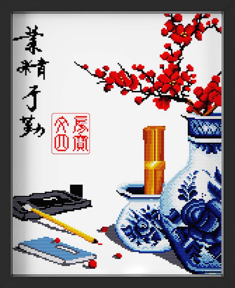 Kreuzstich - Chinesische Schriftzeichen mit Vase | 40x40 cm - Diy - Fadenkunst