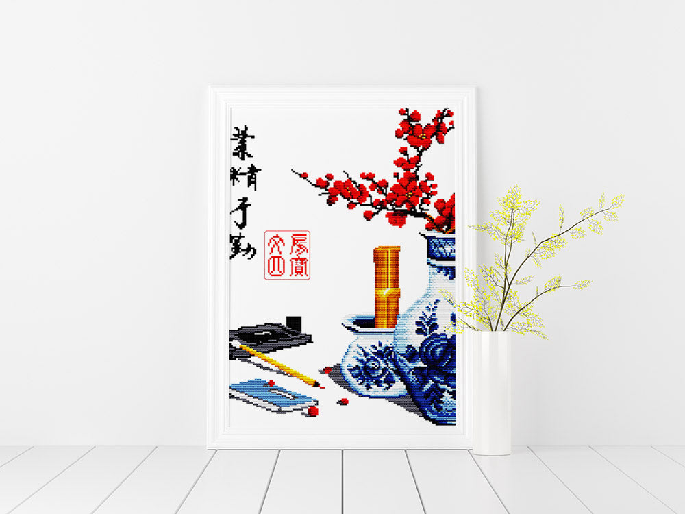 Kreuzstich - Chinesische Schriftzeichen mit Vase | 40x40 cm
