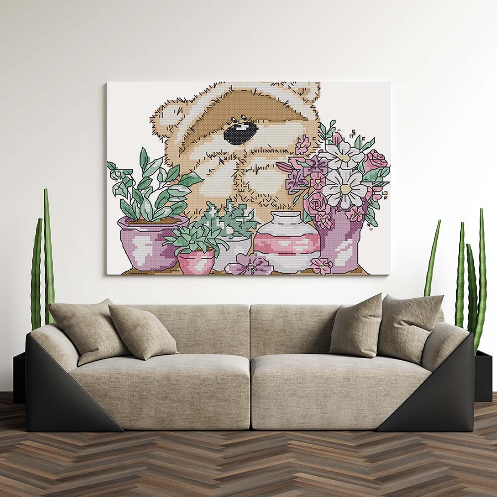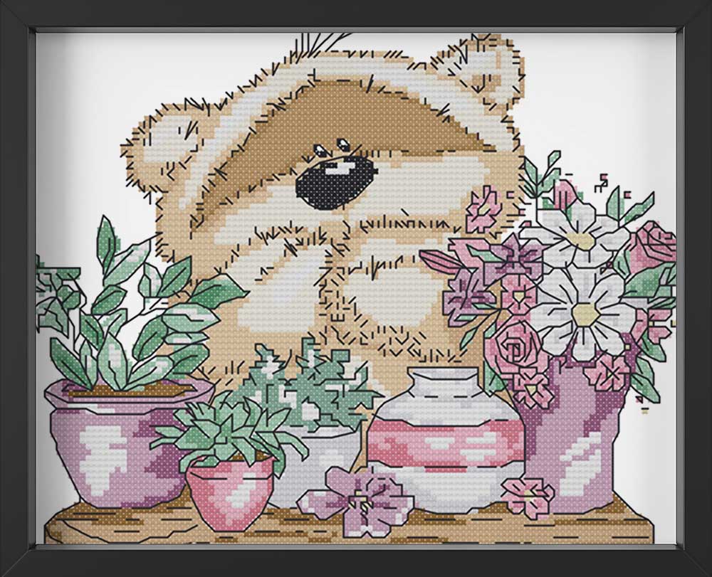 Kreuzstich - Teddy denkt nach mit Blumen | 30x20 cm - Diy - Fadenkunst