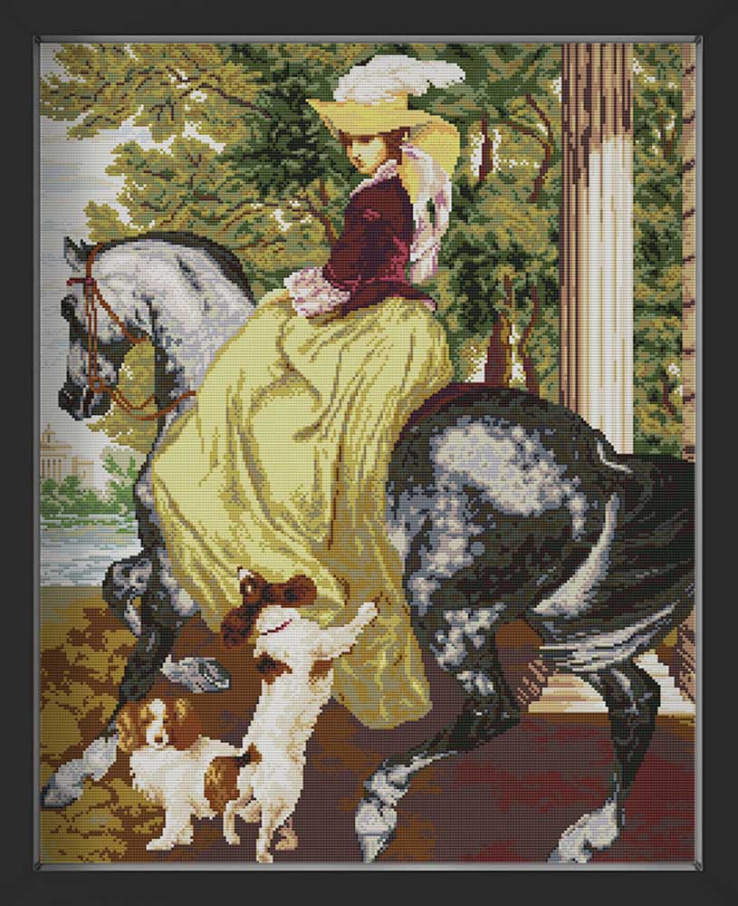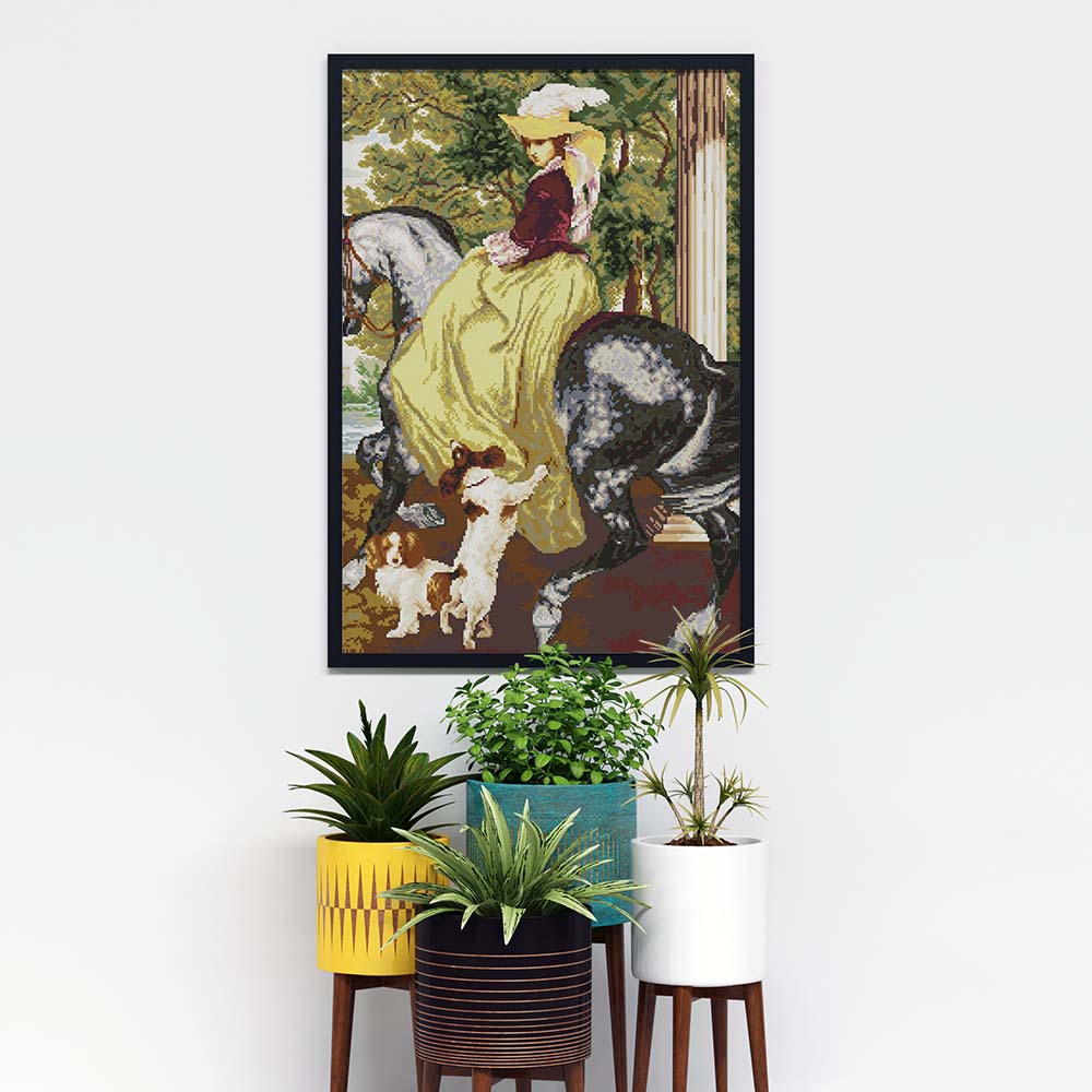 Kreuzstich - Frau auf Pferd mit Hunden | 50x60 cm - Diy - Fadenkunst