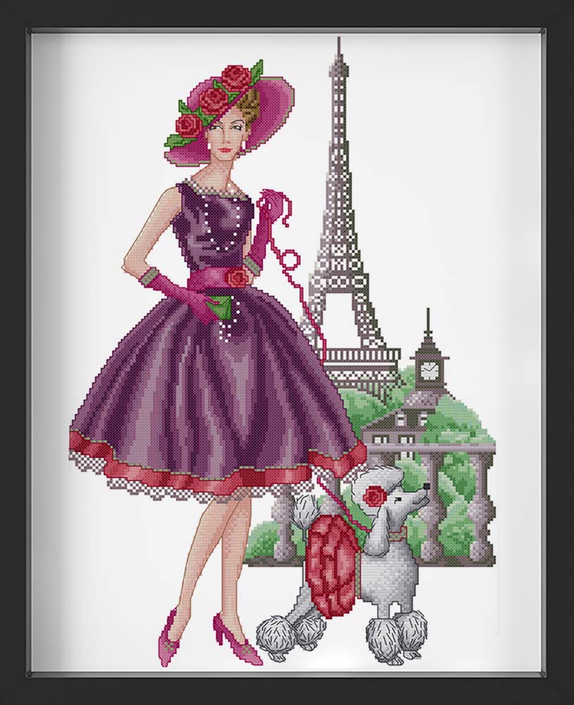 Kreuzstich - Frau mit Pudel in Paris | 30x50 cm - Diy - Fadenkunst