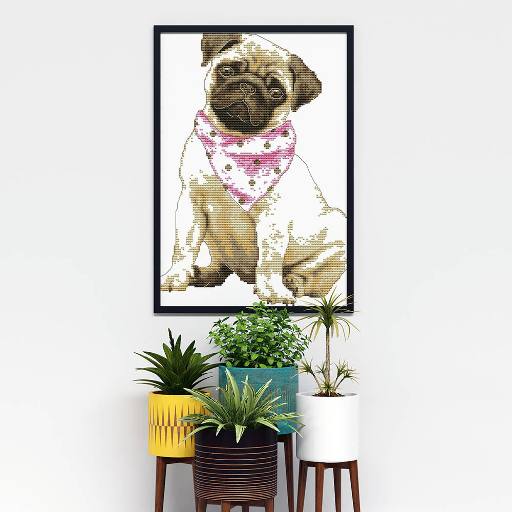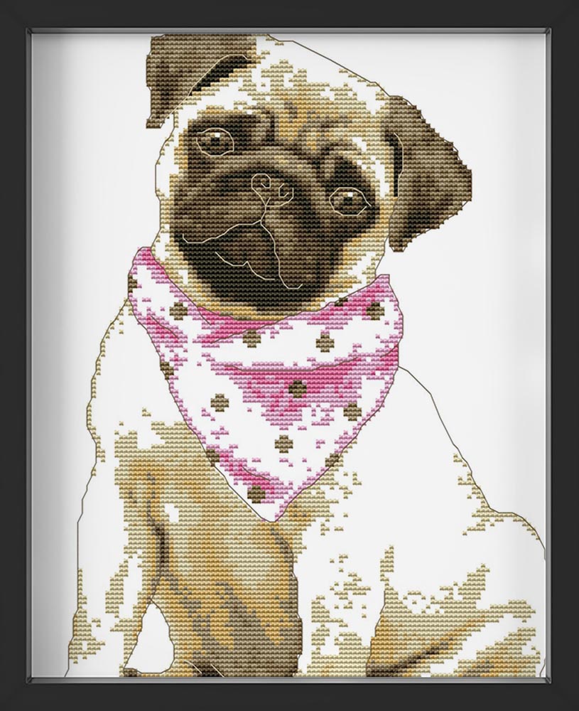 Kreuzstich - Hund Mops mit Halstuch | 30x35 cm - Diy - Fadenkunst