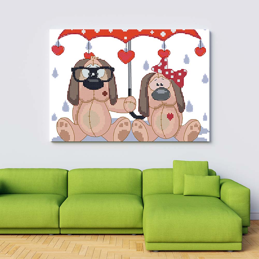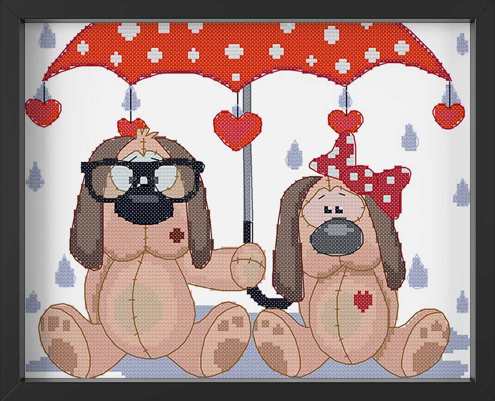 Kreuzstich -  Hunde mit Regenschirm | 30x30 cm - Diy - Fadenkunst