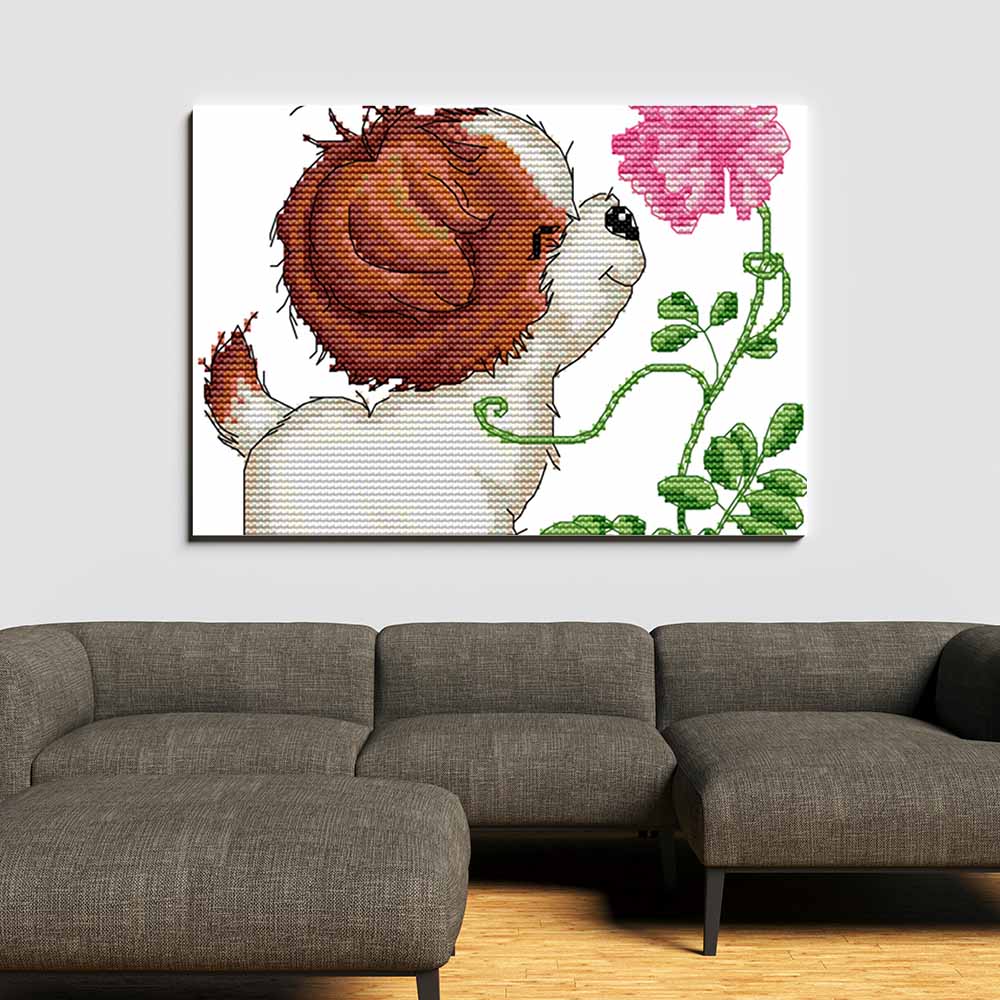Kreuzstich -  kleiner Hund mit Blume | 20x25 cm - Diy - Fadenkunst