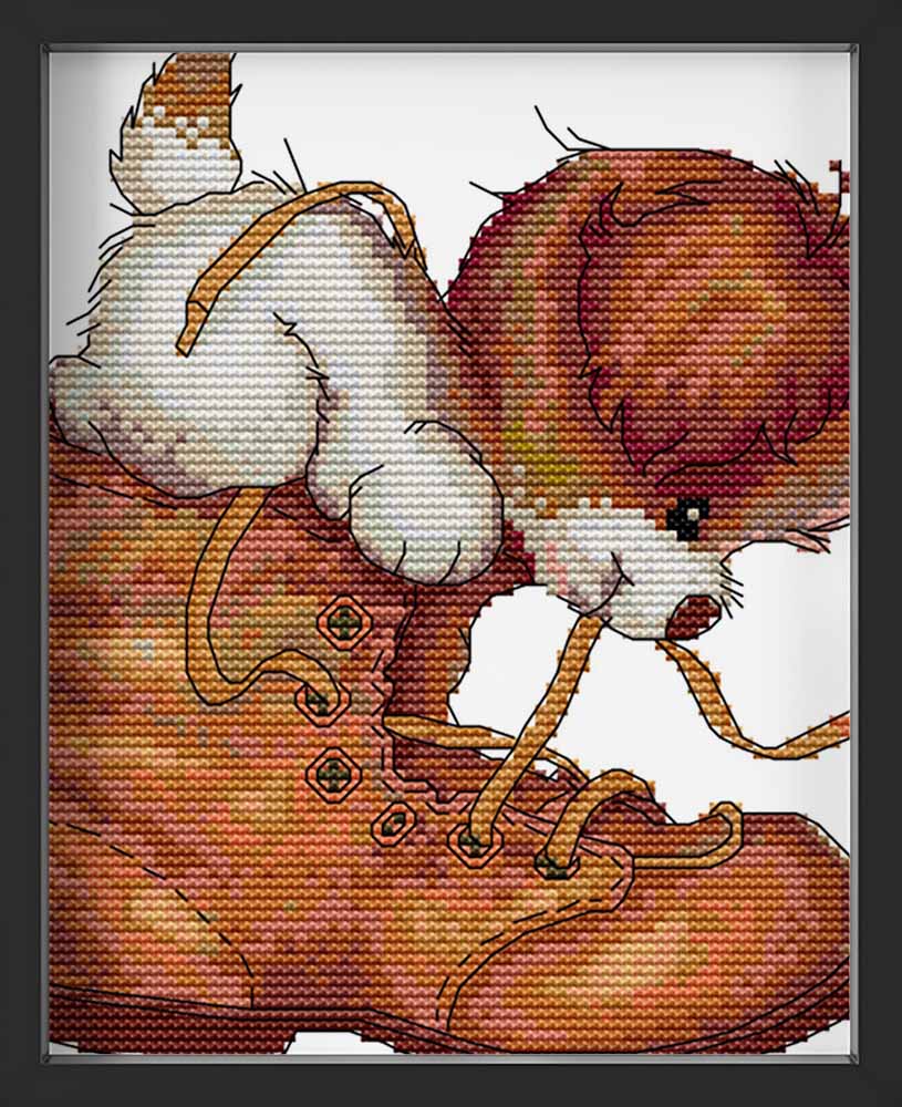 Kreuzstich - kleiner Hund zieht am Schuh | 20x20 cm - Diy - Fadenkunst
