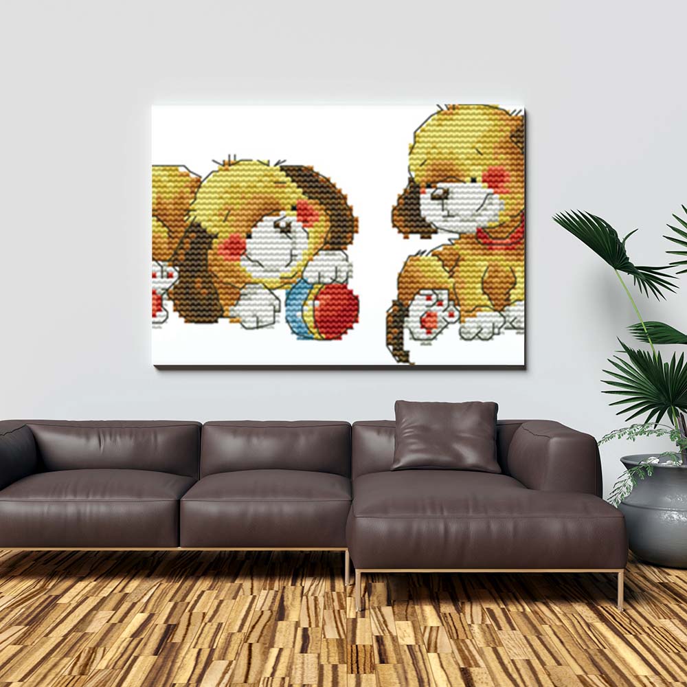 Kreuzstich -  zwei Hunde mit Ball | 40x15 cm - Diy - Fadenkunst