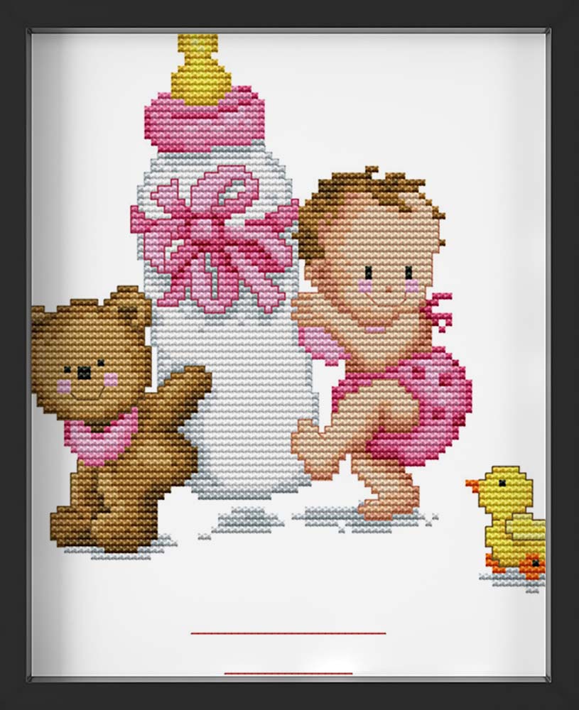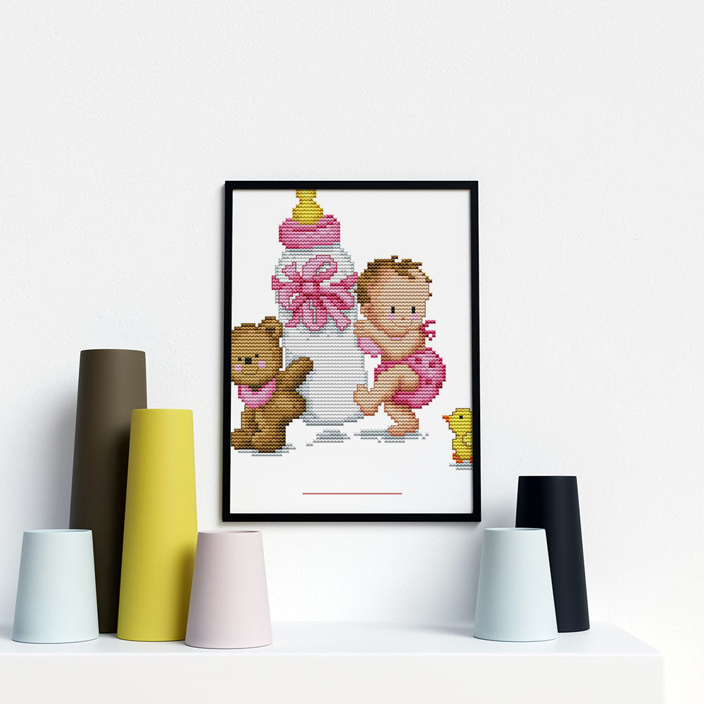 Kreuzstich -  Baby mit Flasche Rosa | 20x25 cm - Diy - Fadenkunst