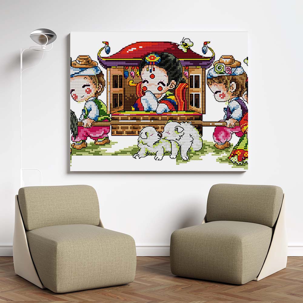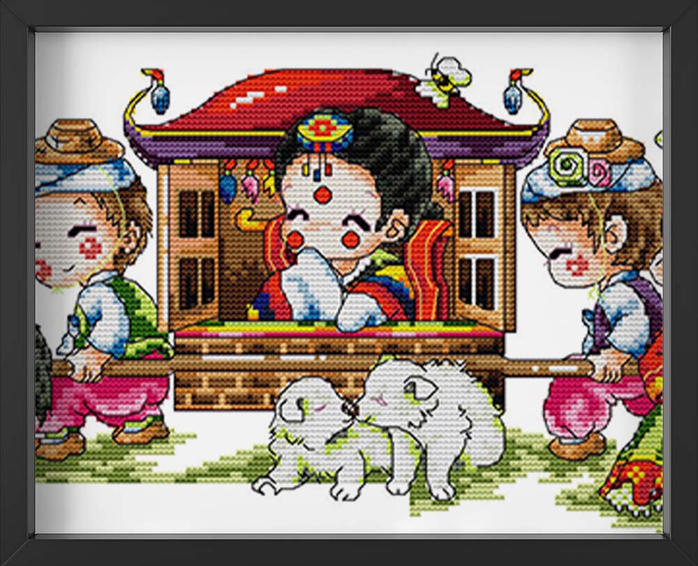 Kreuzstich - drei Kinder mit chinesischer Trage | 50x20 cm - Diy - Fadenkunst