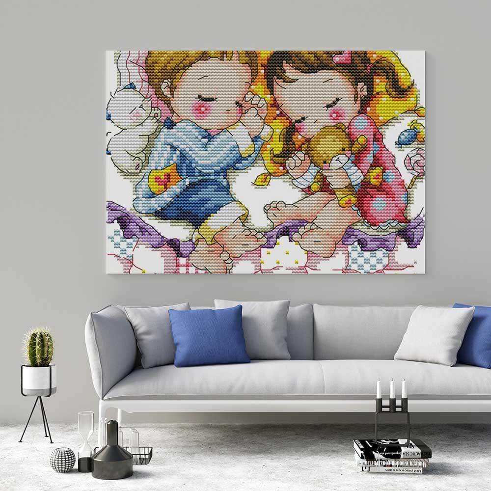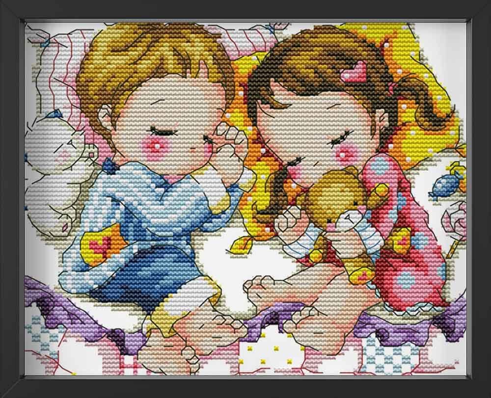 Kreuzstich -  Kinder schlafen mit Teddy| 30x25 cm - Diy - Fadenkunst