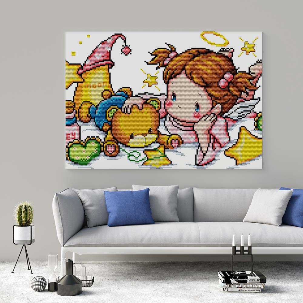 Kreuzstich -  kleines Mädchen mit kleiner Teddy | 45x30 cm - Diy - Fadenkunst