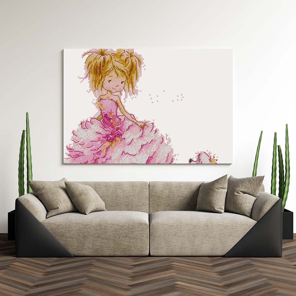 Kreuzstich -  Mädchen im Kleid mit Hund | 30x30 cm - Diy - Fadenkunst