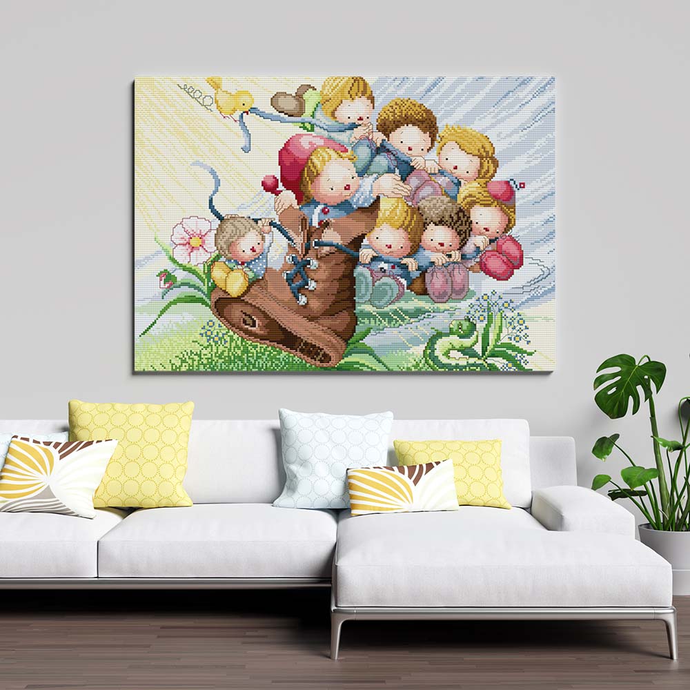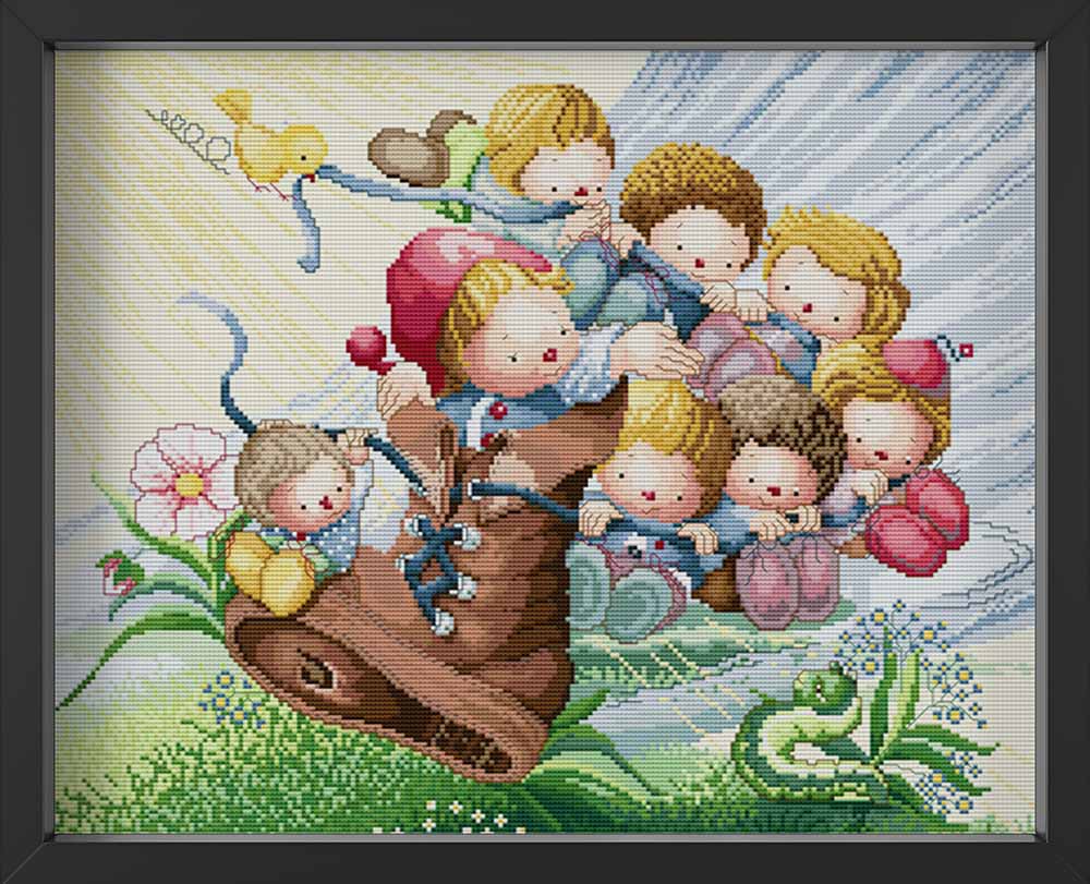 Kreuzstich -  süßes Kinderbild Kind mit Schuh | 50x40 cm - Diy - Fadenkunst