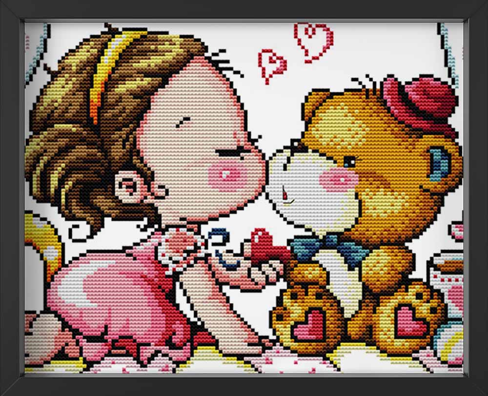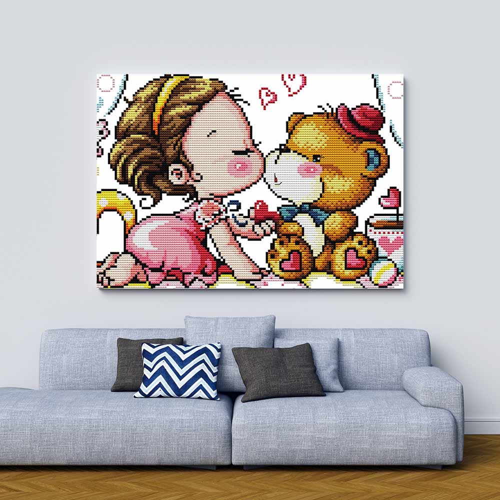 Kreuzstich -  süßes Mädchen mit Teddy | 40x30 cm - Diy - Fadenkunst