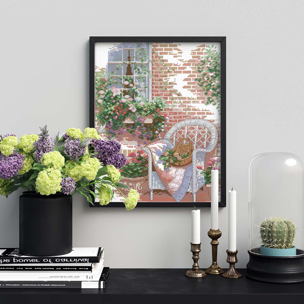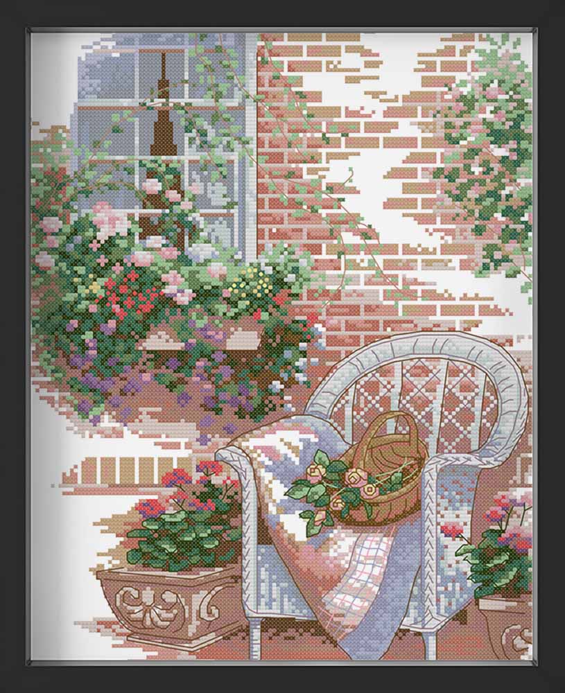Kreuzstich - Gartenstuhl mit Blumen am Haus | 30x40 cm - Diy - Fadenkunst