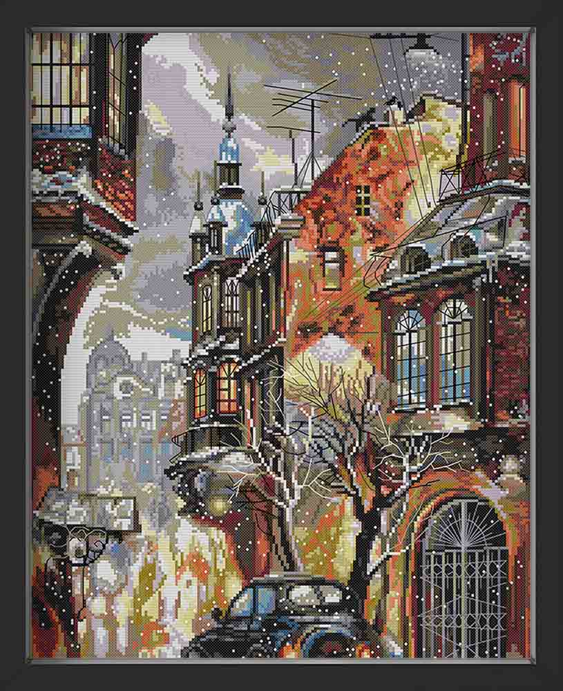Kreuzstich - Häuser im Winter bei Dunkelheit | 40x50 cm