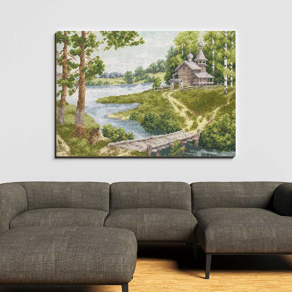 Kreuzstich - Kapelle am Flussufer | 30x40 cm - Diy - Fadenkunst