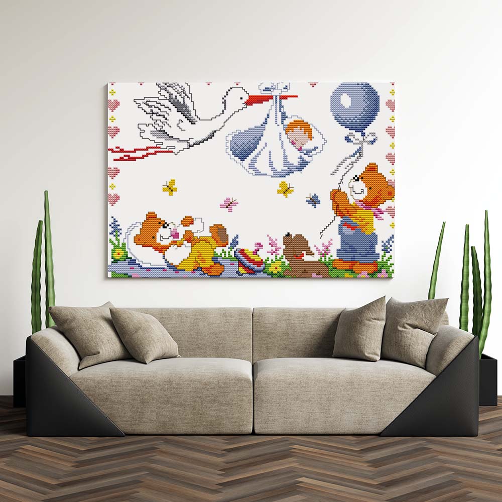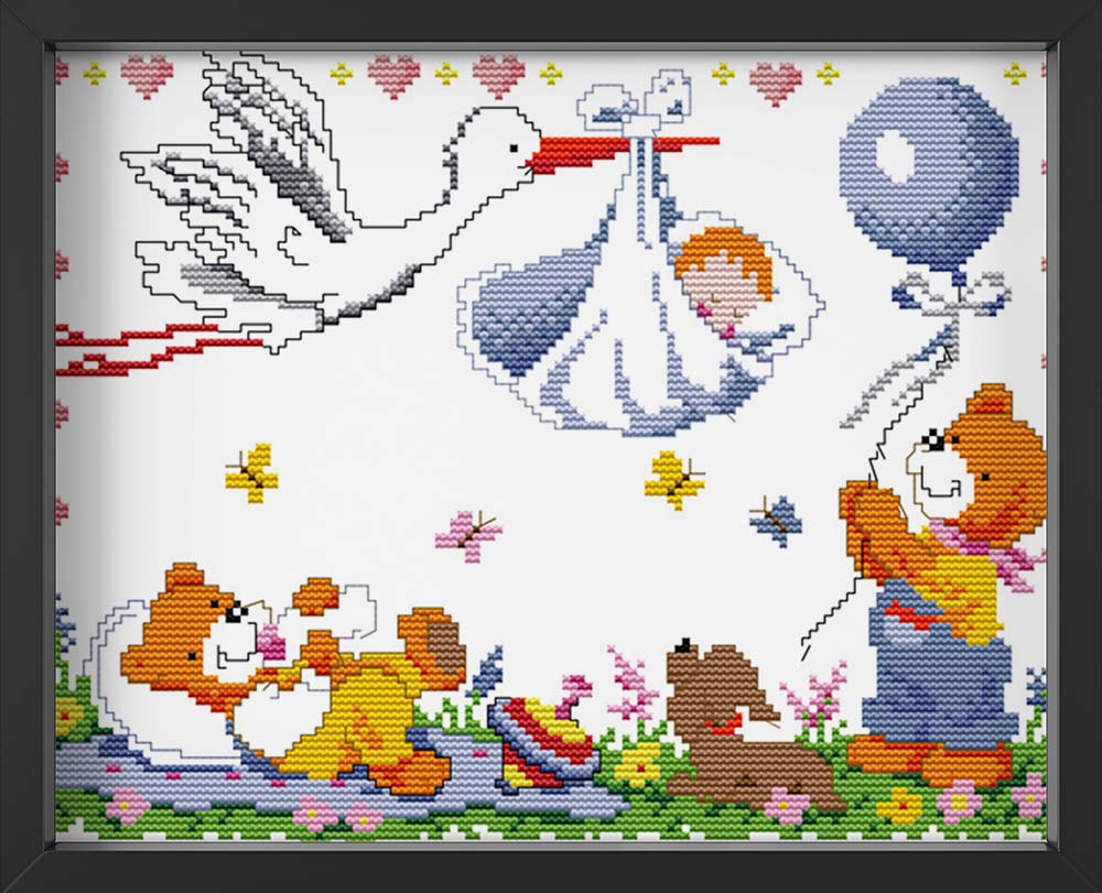 Kreuzstich - Storch mit Baby und Teddys | 30x20 cm - Diy - Fadenkunst