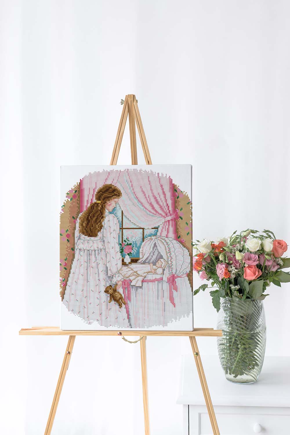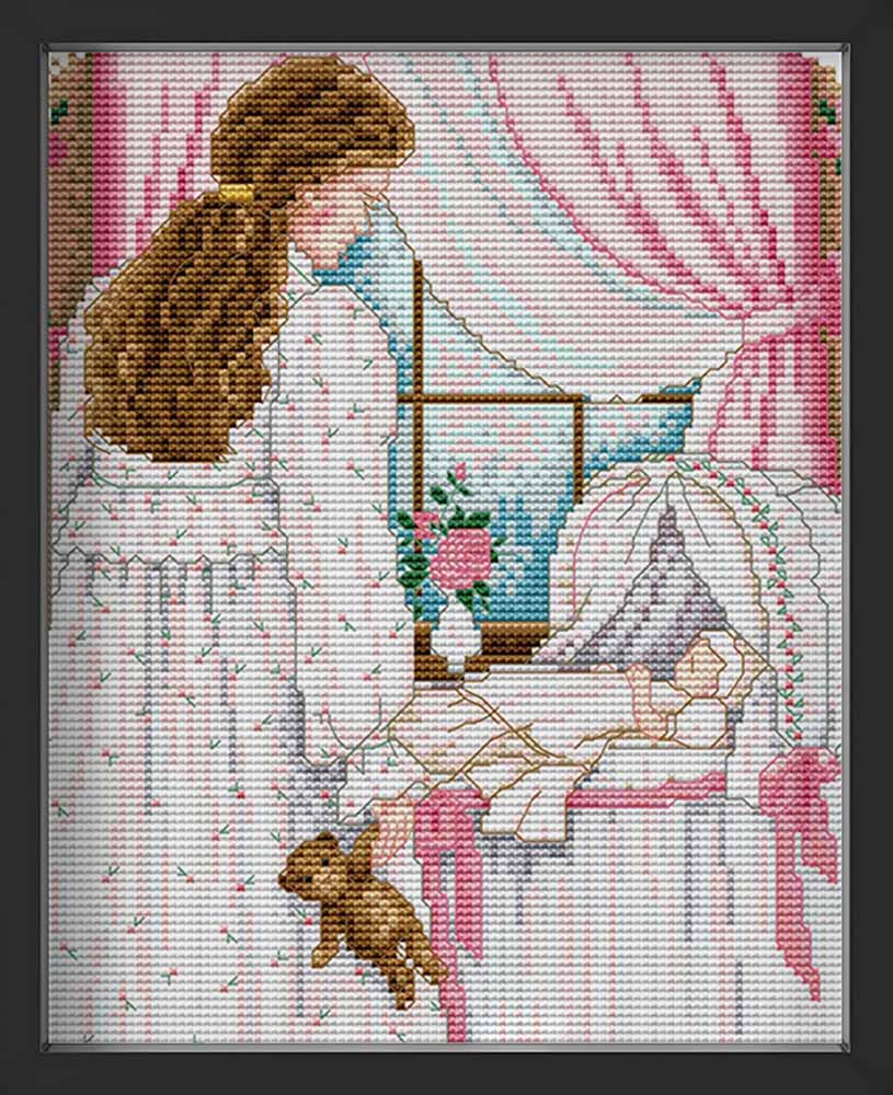 Kreuzstich - Frau vor Babybett | 30x30 cm - Diy - Fadenkunst