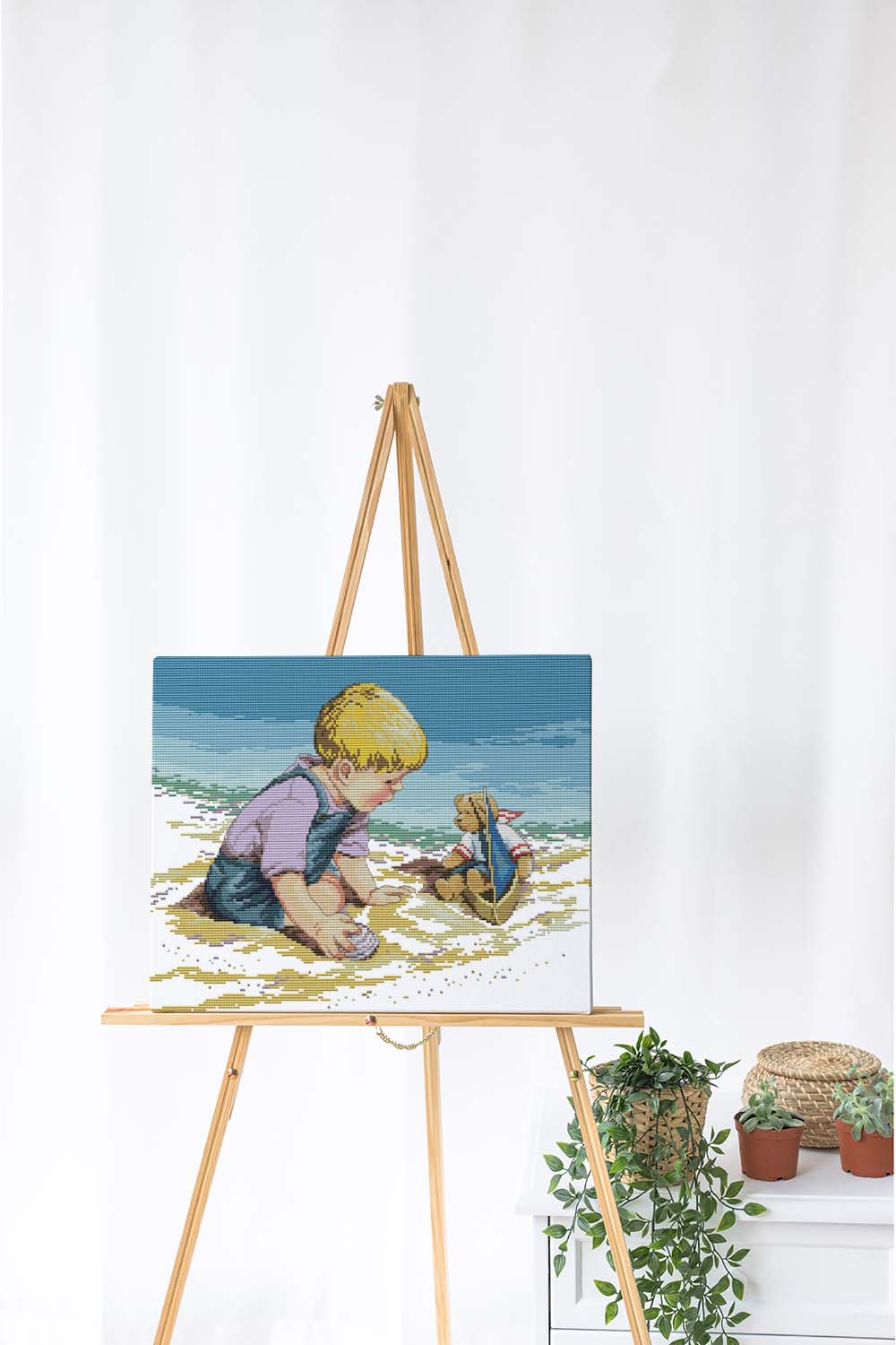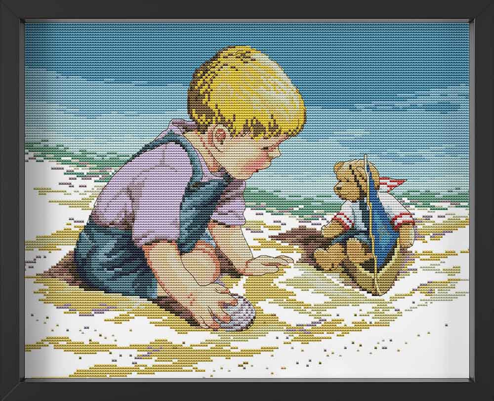 Kreuzstich - kleiner Junge mit Teddybär | 45x35 - Diy - Fadenkunst