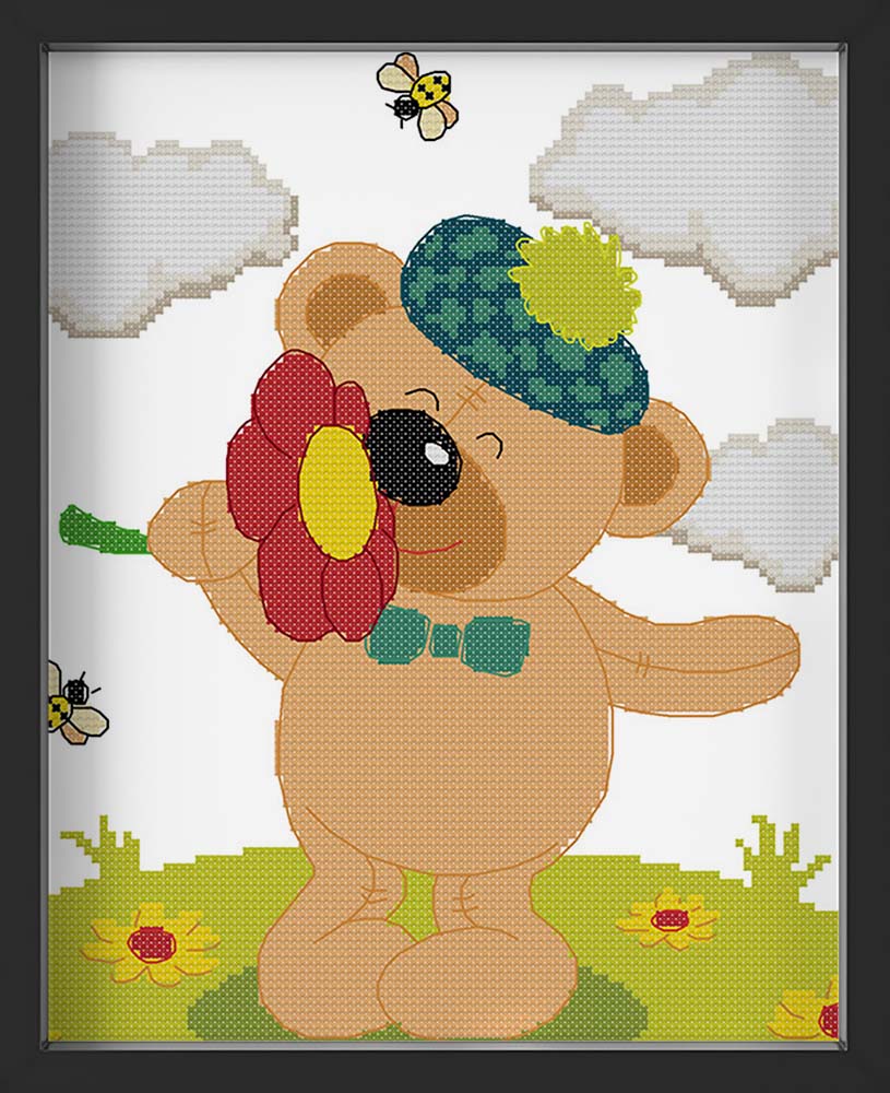 Kreuzstich -  süßer Teddy mit Blume | 30x30 cm - Diy - Fadenkunst