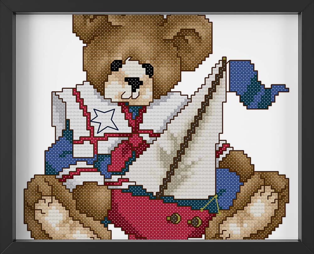 Kreuzstich - Teddy als Seemann mit Schiff | 20x20 cm - Diy - Fadenkunst