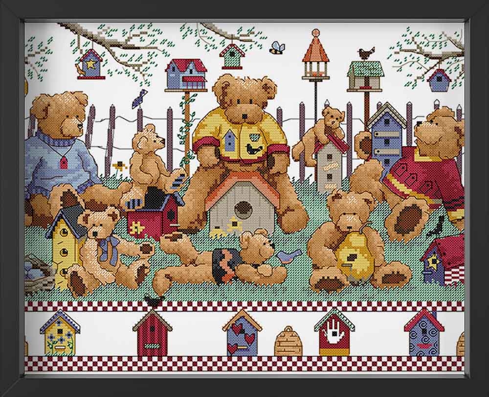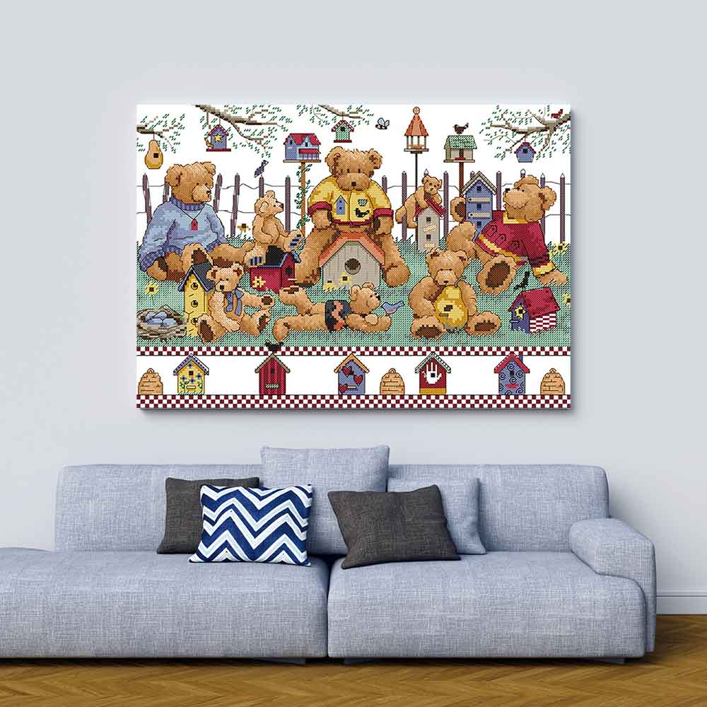 Kreuzstich -  Teddy Familie im Garten | 50x30 cm - Diy - Fadenkunst