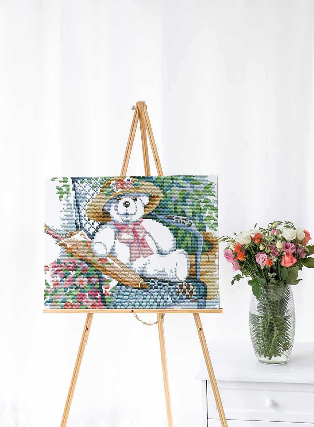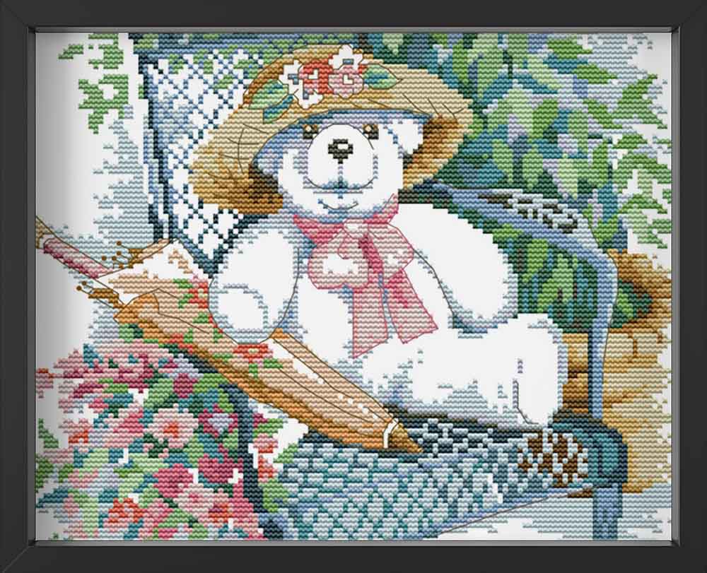 Kreuzstich - Teddy im Garten | 30x30 cm - Diy - Fadenkunst