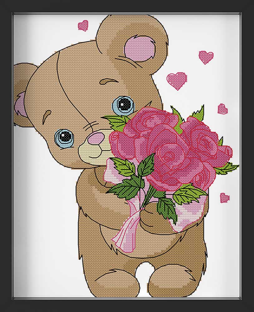 Kreuzstich - Teddy mit Rosenstrauß | 30x30 cm