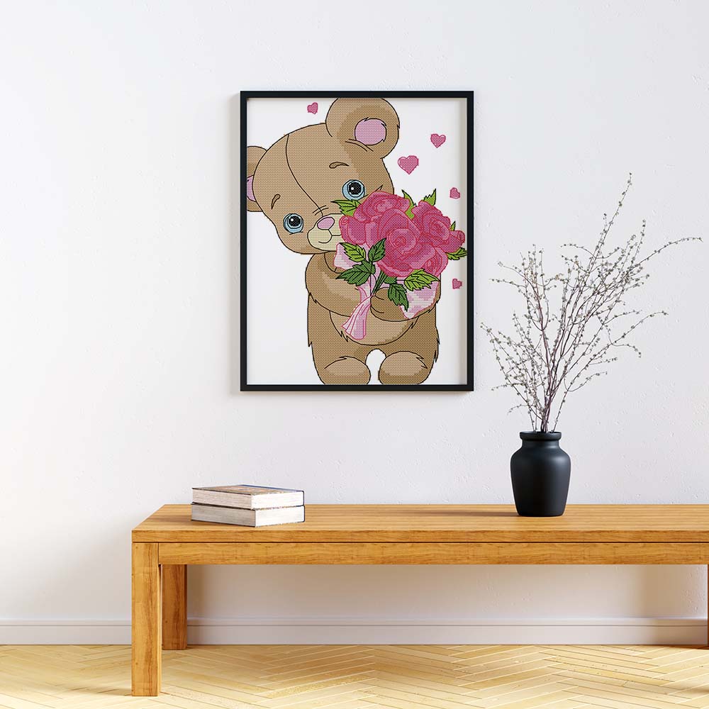 Kreuzstich -  Teddy mit Rosenstrauß | 30x30 cm - Diy - Fadenkunst