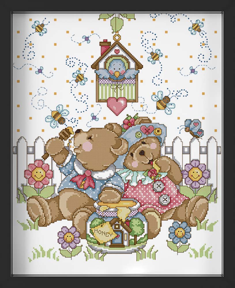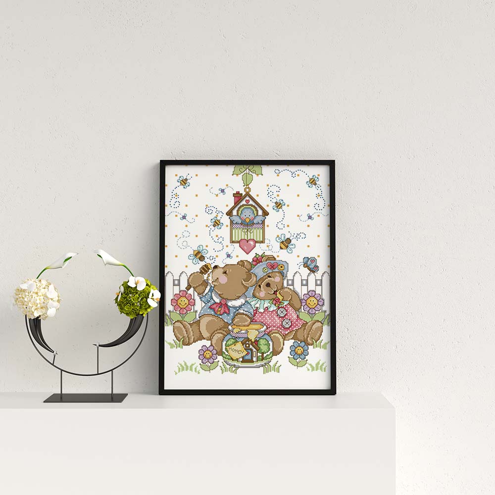 Kreuzstich - Teddys mit Honig | 40x50 cm - Diy - Fadenkunst