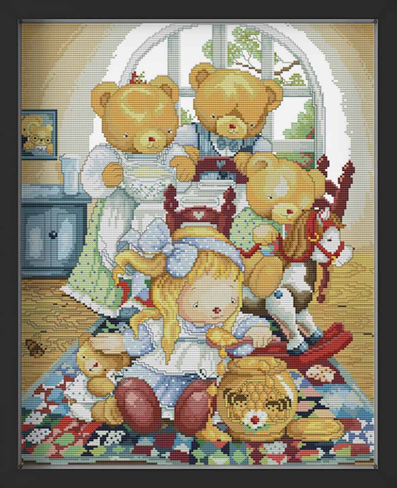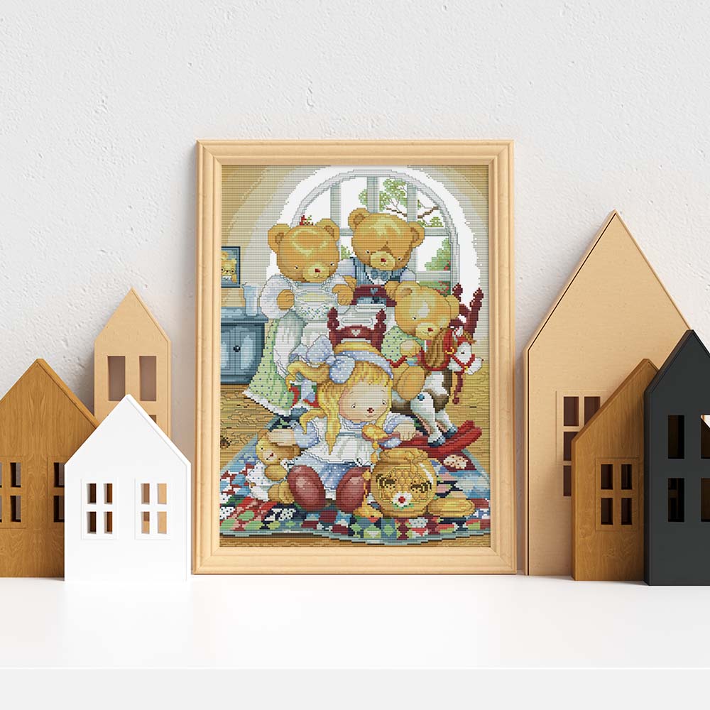 Kreuzstich - Teddys mit Mädchen im Spielzimmer | 40x50 cm - Diy - Fadenkunst