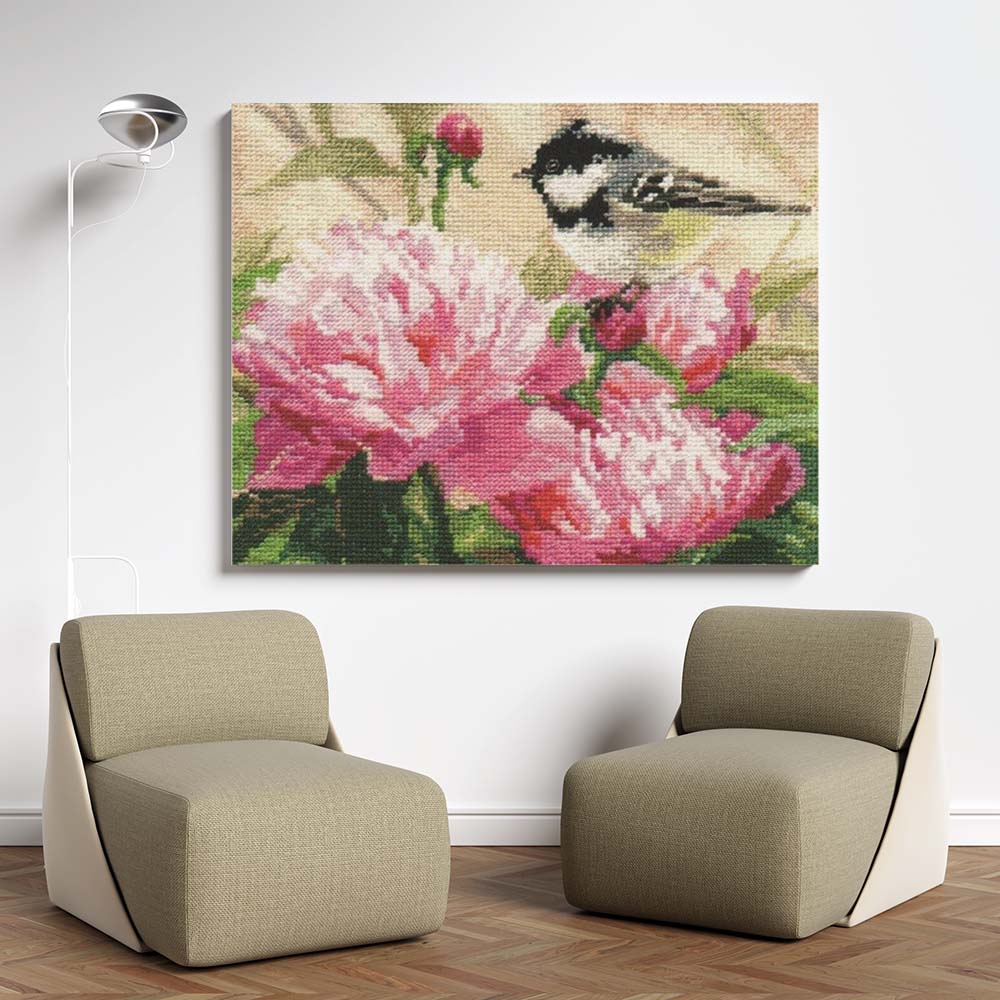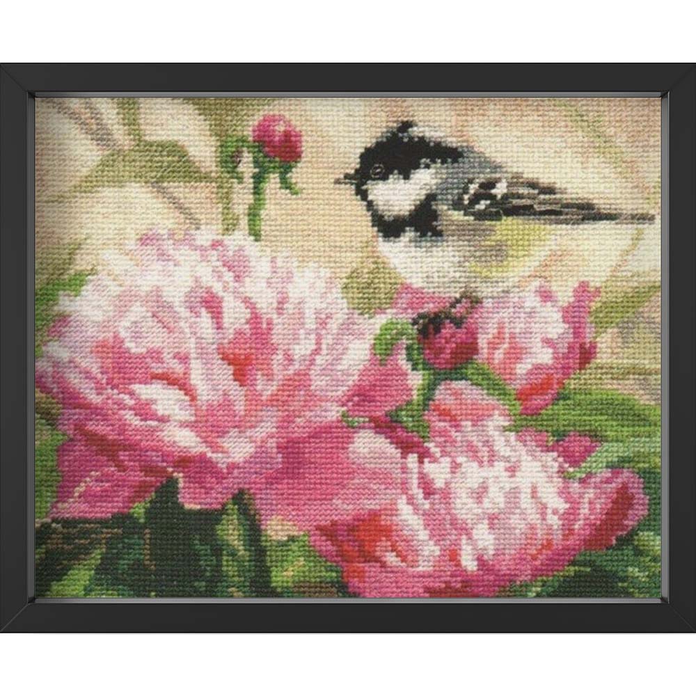 Kreuzstich - Meisen und Pfingstrosen | 20x20 cm