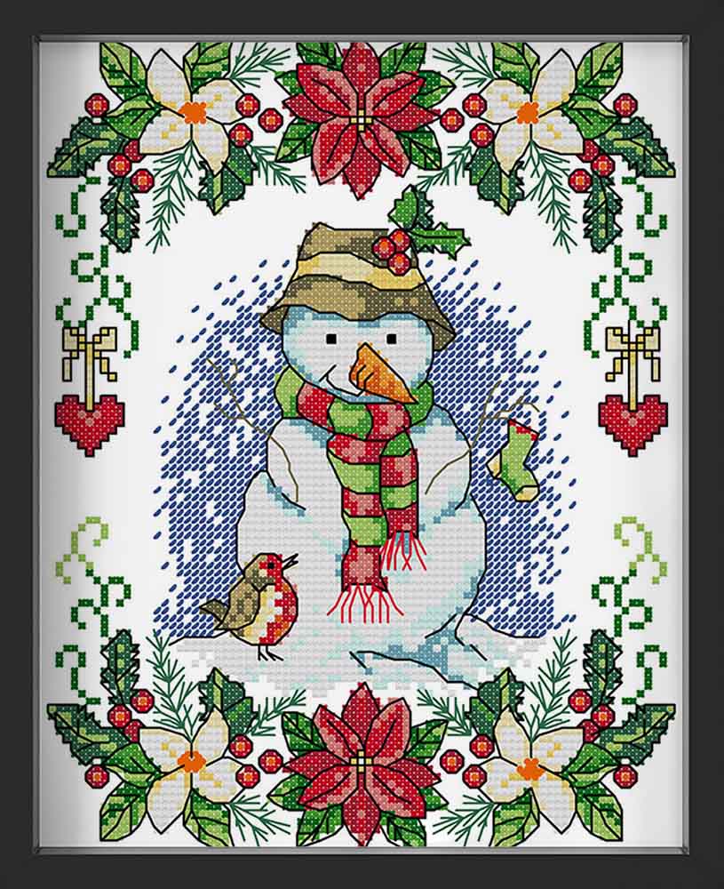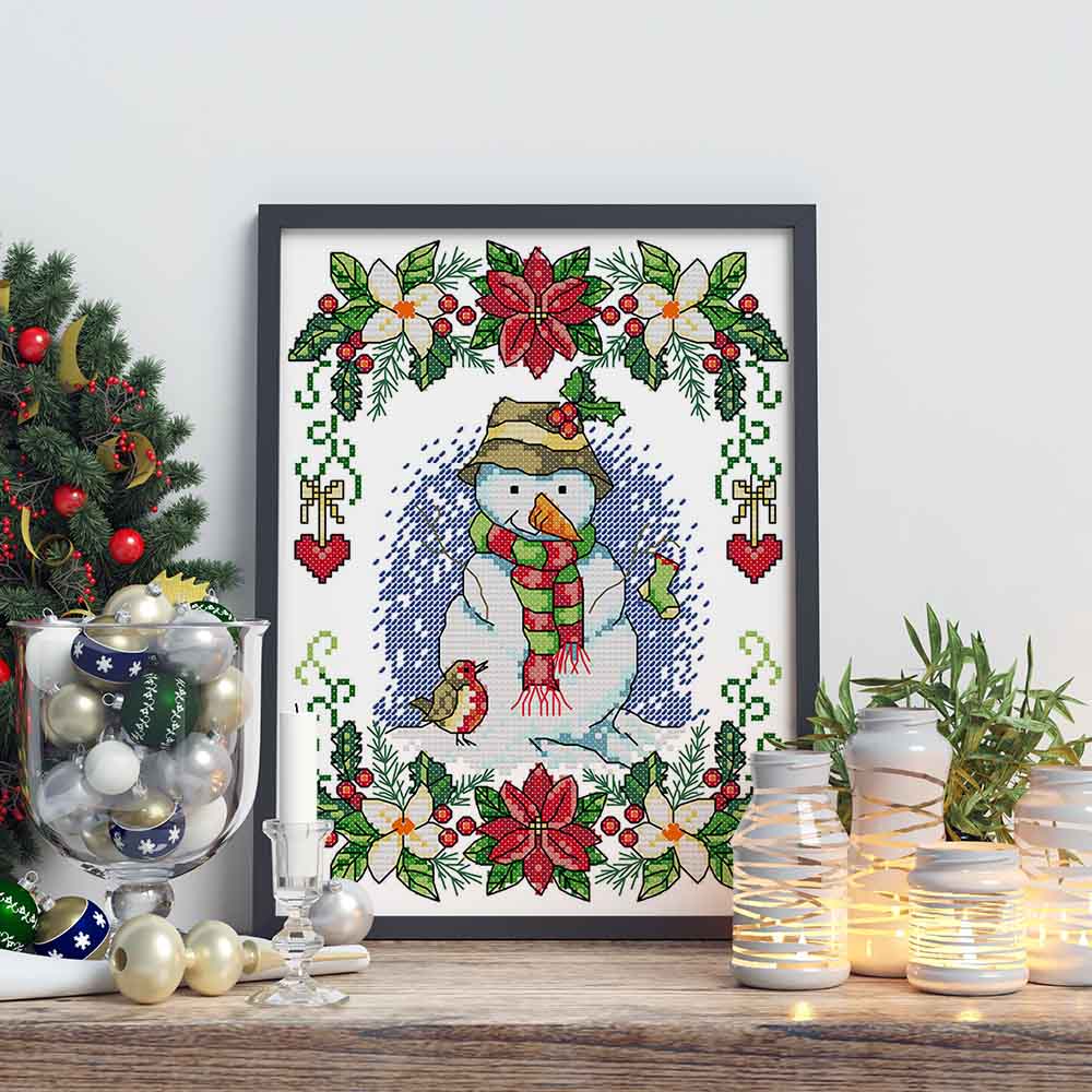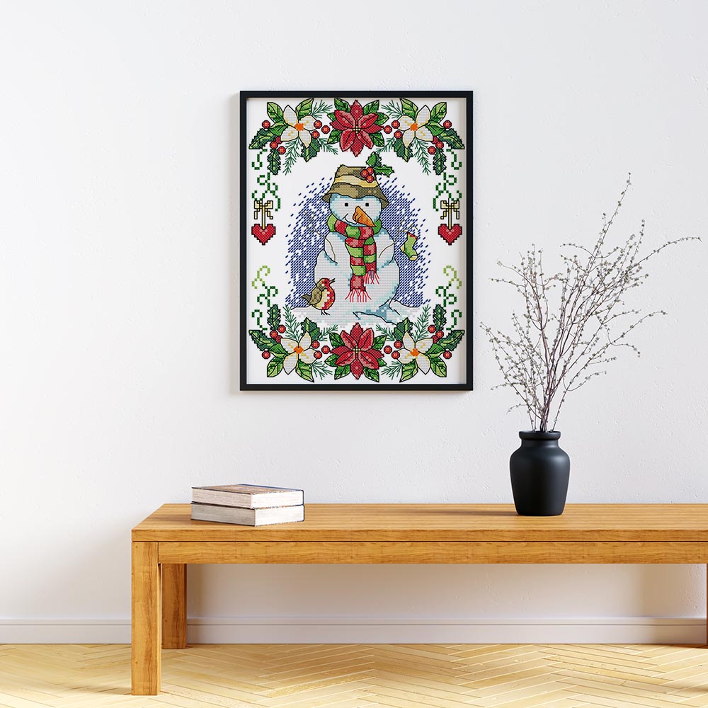 Kreuzstich - Schneemann mit Vogel | 20x30 cm - Diy - Fadenkunst