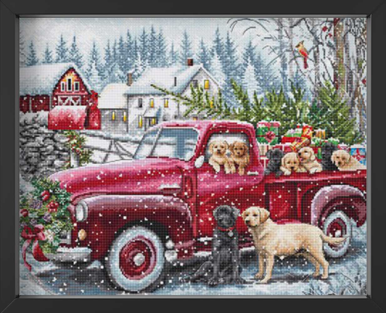 Kreuzstich - Weihnachtsauto mit Hundefamilie | 27x22 cm