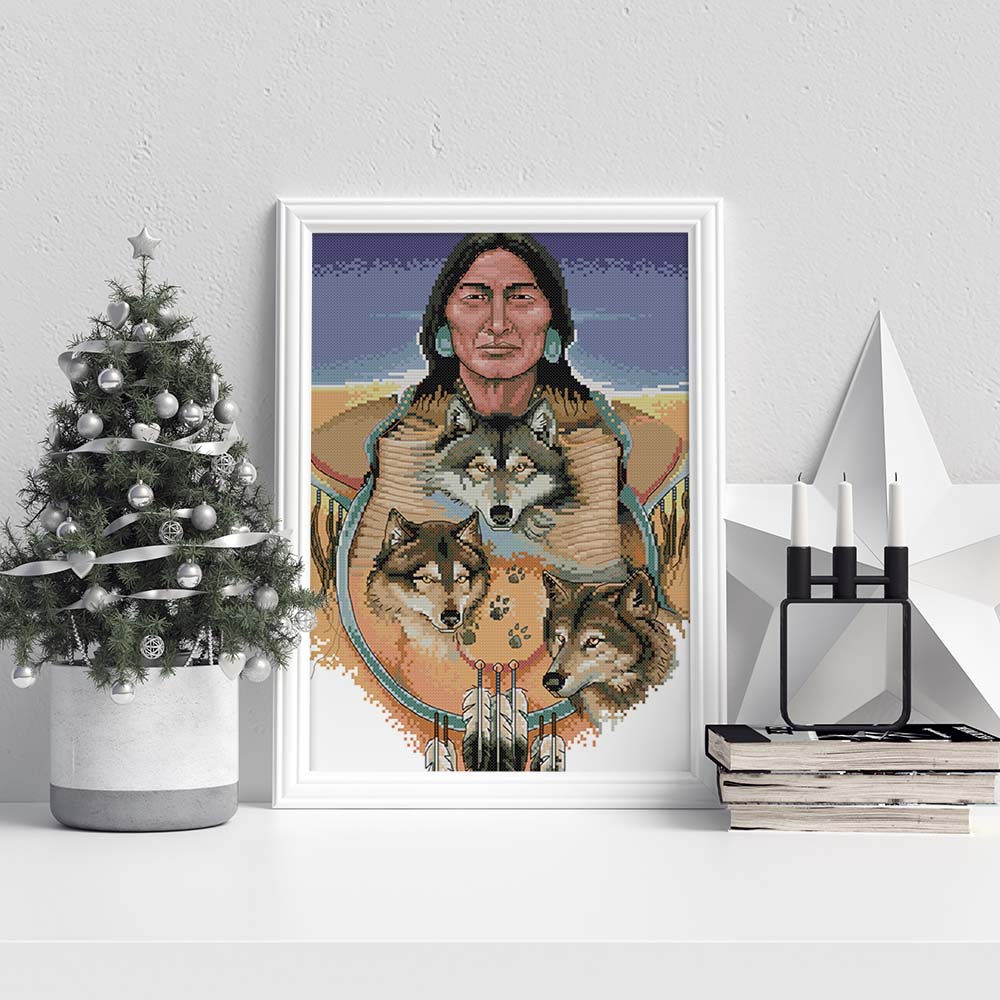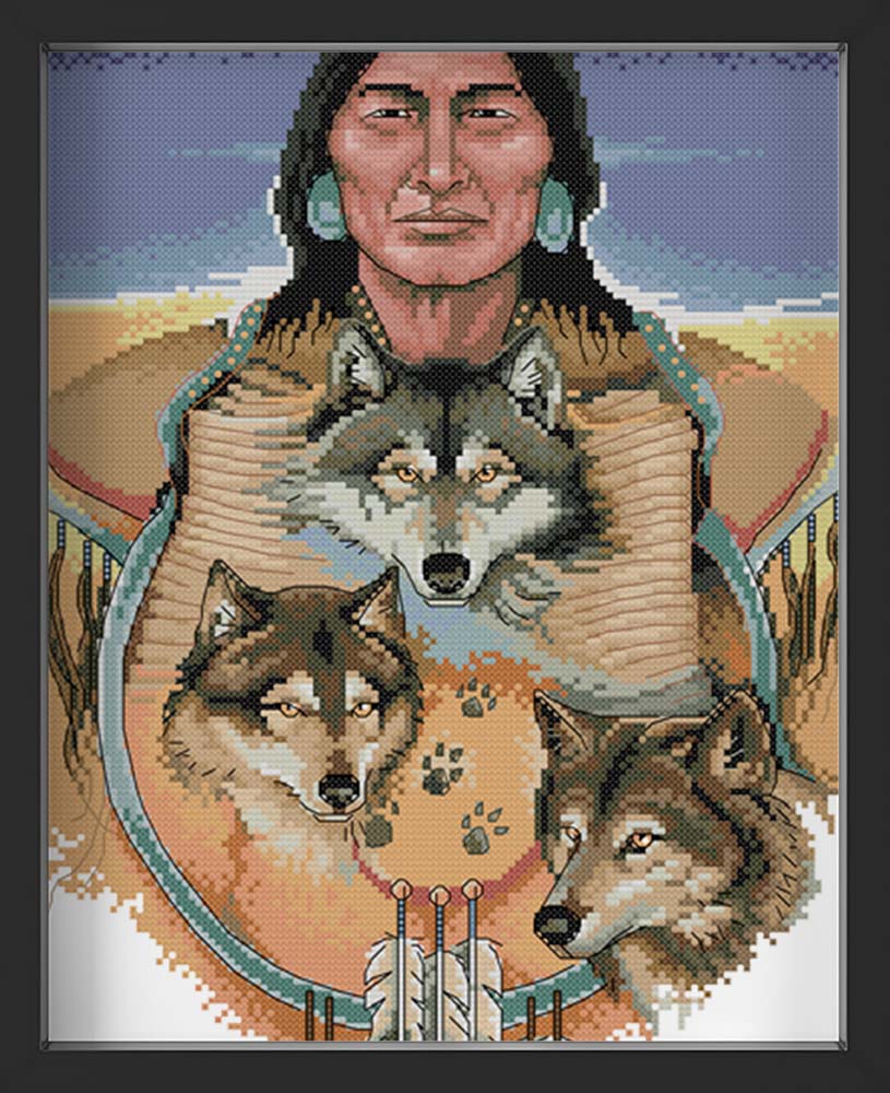 Kreuzstich -  Indianer mit Wölfen | 30x40 cm - Diy - Fadenkunst